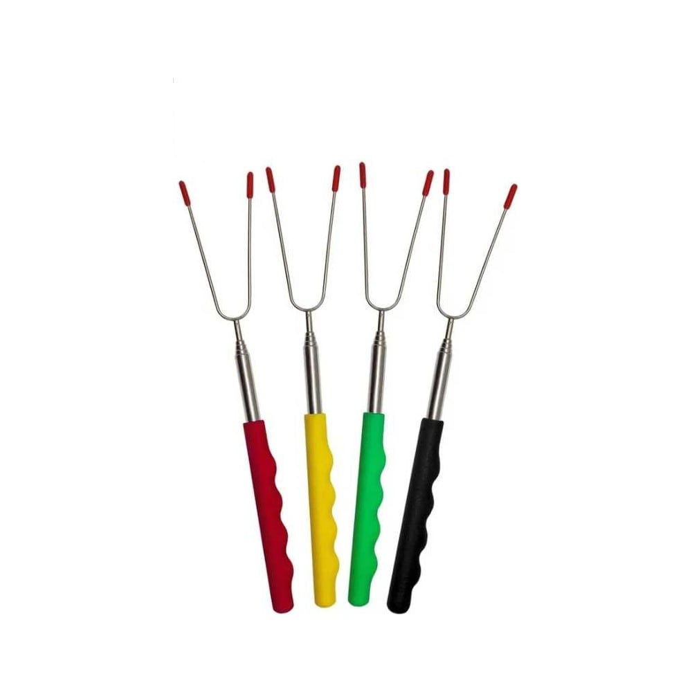 Набор из 4 цветных телескопических вилок-шампуров изготовлен из высококачественной нержавеющей стали. Он идеально подходит для жарки продуктов на костре, мангале или барбекю. Ручки представлены в четырех приятных для глаз цветах. Благодаря эргономичному волнистому дизайну вилку удобно держать в руке, а не проводящий тепло материал защитит руки от ожога. Телескопический стержень регулируется по длине от 5 до 50 см, что позволяет держать руку на безопасном расстоянии от огня. На зубцы вилки легко нанизать маршмэллоу, колбаски, овощи, кусочки мяса, креветки и другие продукты для барбекю. Важно: перед использованием снять силиконовые защитные колпачки с наконечников вилки; отрегулировать стержень на необходимую длину; после использования промыть вилки мыльной водой и просушить; надеть защитные колпачки на наконечники вилок перед хранением; при длительном контакте с огнем наконечники вилок чернеют, что является нормальным для материала, из которого изготовлен набор.