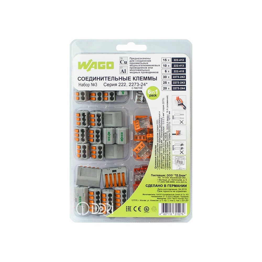 Набор клемм №3 WAGO (222-412, 222-413, 222-415, 2273-242, 2273-243, 2273-244) 106 шт. 42556 используется для соединения проводов с одной или несколькими жилами, а также разных сечений. У этого способа скрепления есть ряд преимуществ: высокая скорость соединения, надежность и удобство дальнейшей работы с проводами, их обслуживания. Проводящая часть соединителя изготовлена из меди.