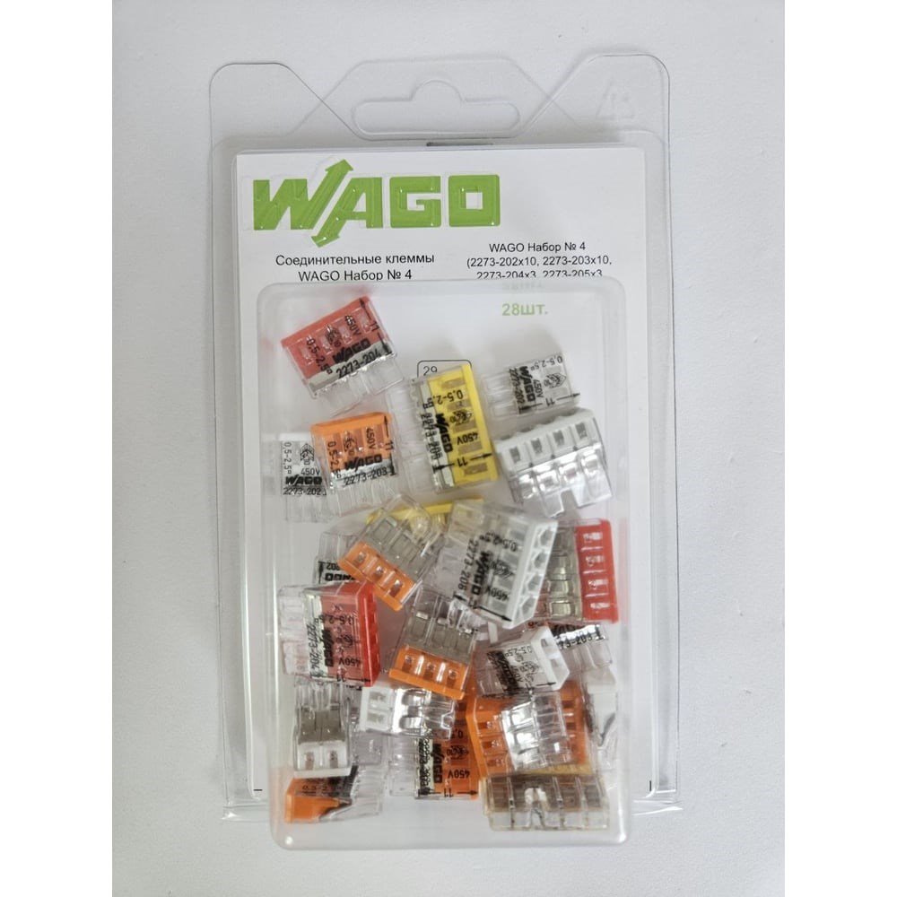 Набор клемм №4 WAGO (2273-202, 2273-203, 2273-204, 2273-205, 2273-208) 30 шт. 45915 используется для соединения проводов с одной или несколькими жилами, а также разных сечений. У этого способа скрепления есть ряд преимуществ: высокая скорость соединения, надежность и удобство дальнейшей работы с проводами, их обслуживания. Проводящая часть соединителя изготовлена из меди.