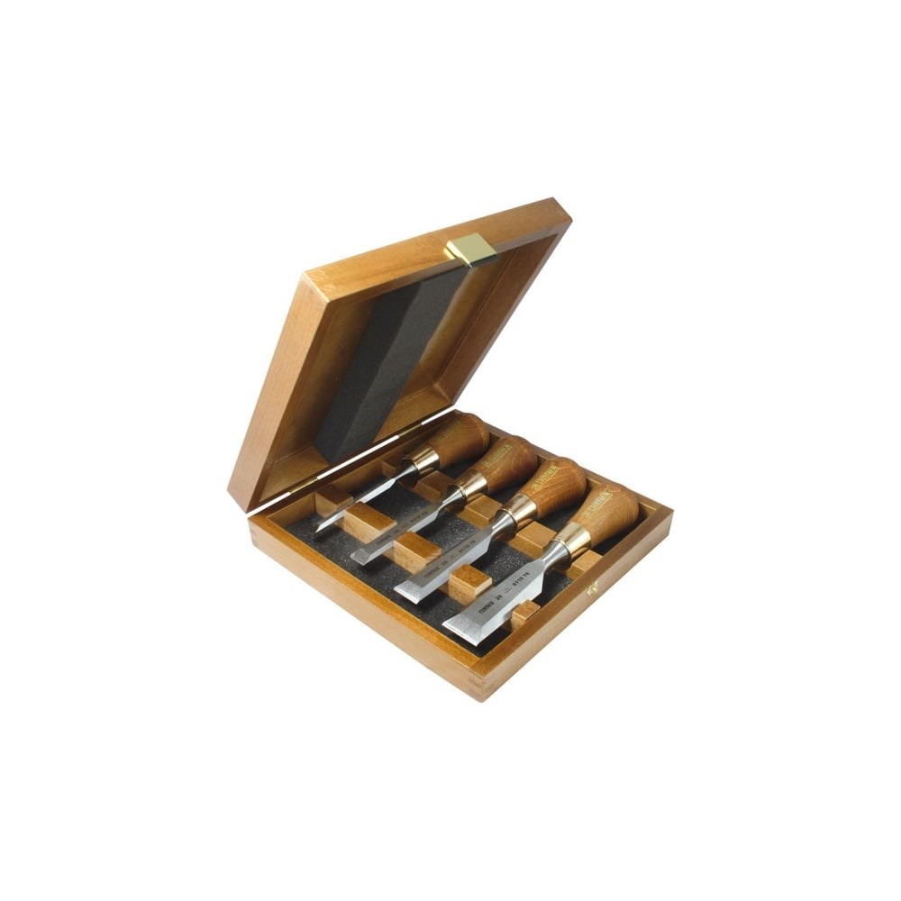 Набор из 4 зачистных стамесок в деревянном ящике NAREX 853750 состоит из прочных и качественных режущих инструментов, которые выкованы из высоколегированной хром-марганцевой (Cr-Mn) стали. Металлические полотна термически обработаны и по уровню твердости соответствуют 59 Нrс. Короткие рукоятки изделий выполнены из древесины бука и имеют удобное в обхвате круглое исполнение. Латунные обжимные кольца обеспечивают прочность конструкции рукояток. Размер ручек: 76x37 мм.