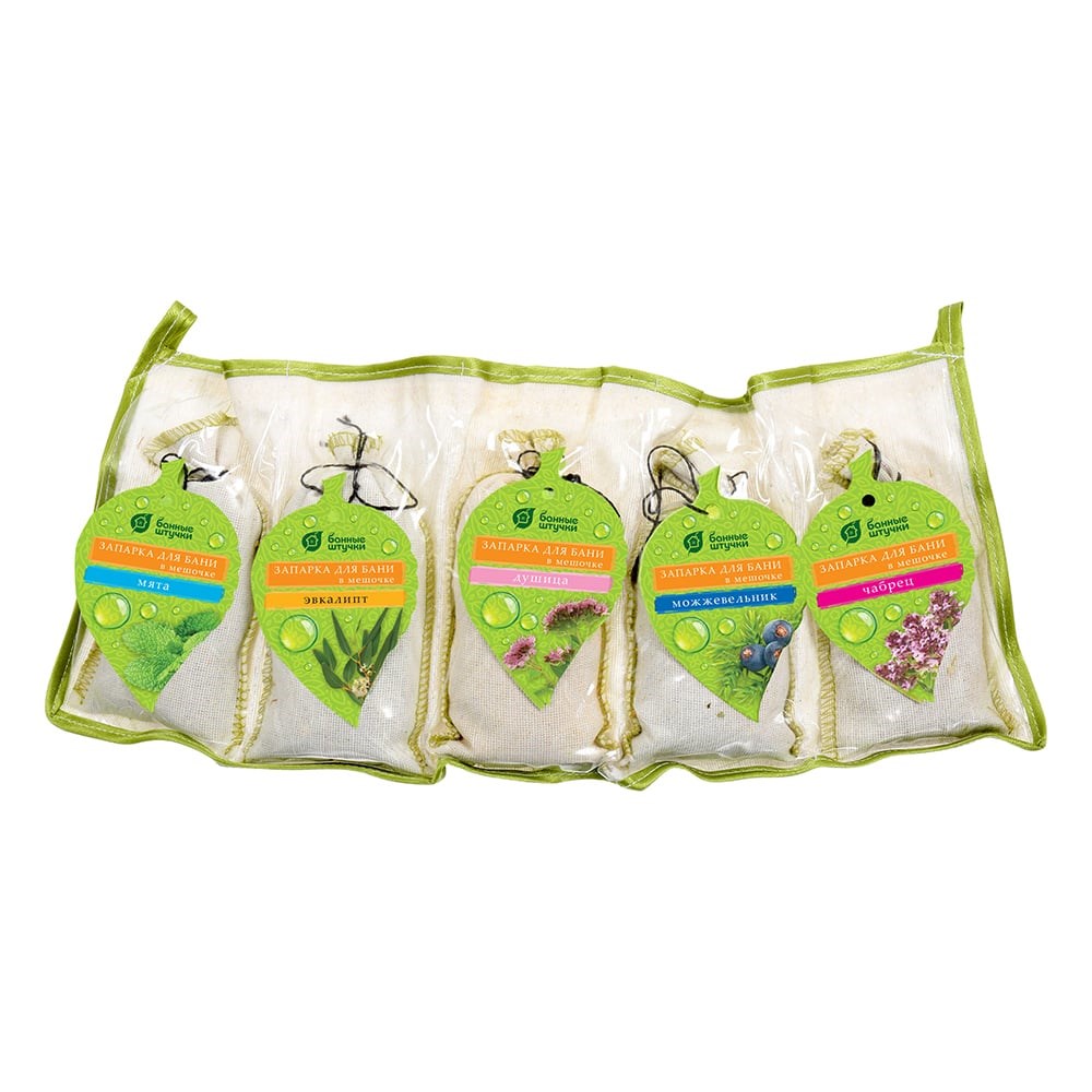 Набор запарок в сумочке Банные Штучки 5шт 32160 применяется для каменки или для ванн. Мята освежает, тонизирует кожу делает ее более бархатистой. Эвкалипт оказывает антибактериальное действие, а так же помогает снять воспаление суставов. Душица расслабляет и успокаивает. Можжевельник помогает избавится от бессонницы. Чабрец обладает антимикробным действием и избавляет от головной боли.
