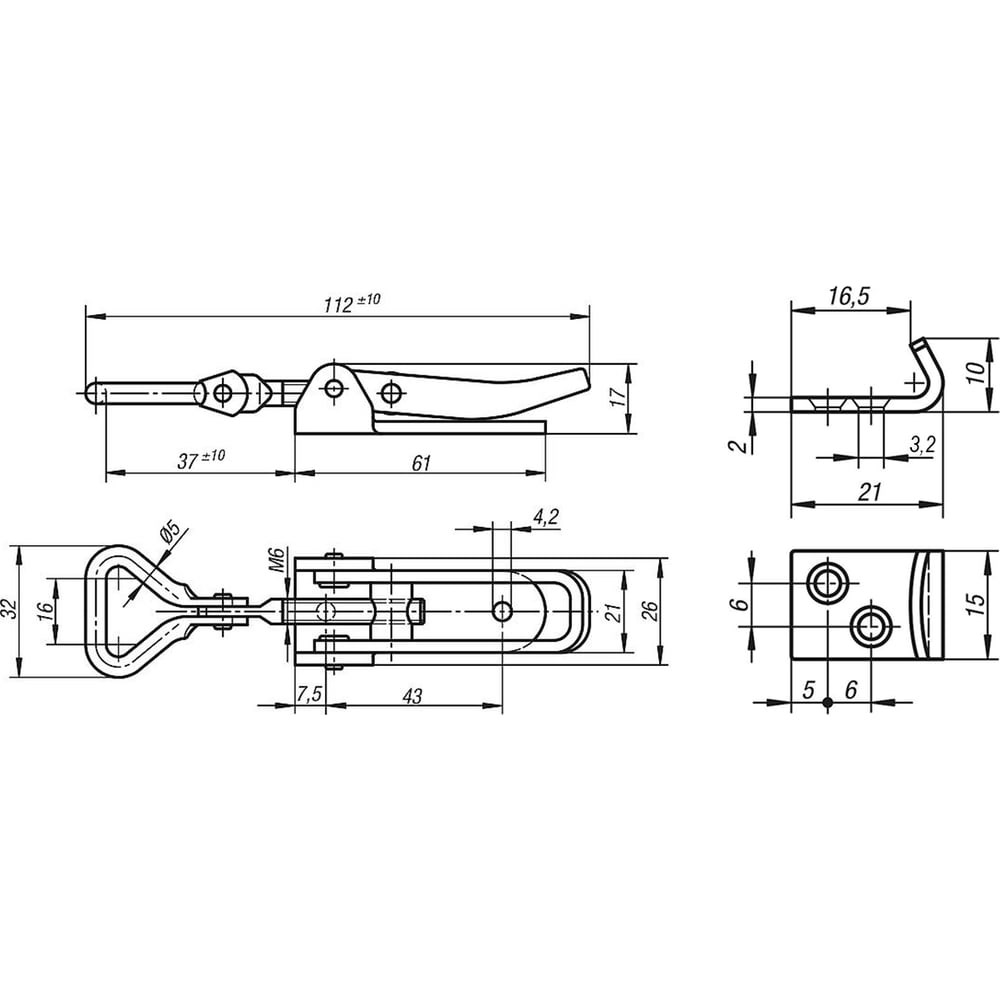 Накидная защелка со скобой KIPP K0050.1421121.9135211: Материал и исполнение: Сталь, оцинкованная с синим пассивированием. Указание: Регулируемые натяжные защелки служат надежной системой запирания и применяются в промышленности. За счет прохождения мертвой точки они становятся устойчивы к вибрации. После того как скоба вошла в зацепление с крюком, можно стягивать соединяемые детали натяжением рукоятки до 15 мм. Для выравнивания допусков или для создания достаточного натяжения скоба регулируется шпинделем (M6). Натяжные защелки могут привинчиваться или приклепываться. Усилие зажима F1 обеспечивает натяжная защелка, а не крюк. Усилие зажима F1 Н: 1000.