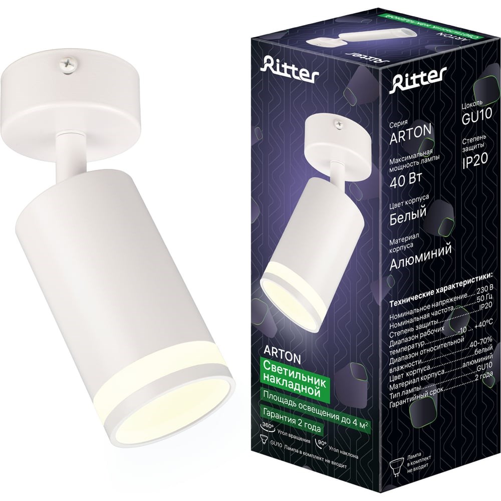 Накладной поворотный светильник RITTER Arton цилиндр 55x100 GU10 алюминий/стекло белый 59970 8 предназначен для акцентного освещения интерьера. В светильнике предусмотрена одна лампочка с цоколем GU10, максимальной мощностью 40 Вт. Светильник просто монтируется и надежно фиксируется. Спот можно использовать в качестве настенного светильника вместо традиционных бра. А также вешать как потолочный светильник. Строгие геометрические формы светильника позволяют использовать его как в классических, так и в современных дизайнерских интерьерах. Накладные светильники часто располагают в гостиных, коридорах, спальнях и детских в качестве дополнительного источника света. А в небольших помещениях накладной спот может являться основным источником освещения. Благодаря цилиндрической форме поворотного светильника, свечение лампы распределяется ярко и равномерно, что позволяет получить больше света от одной лампочки.
