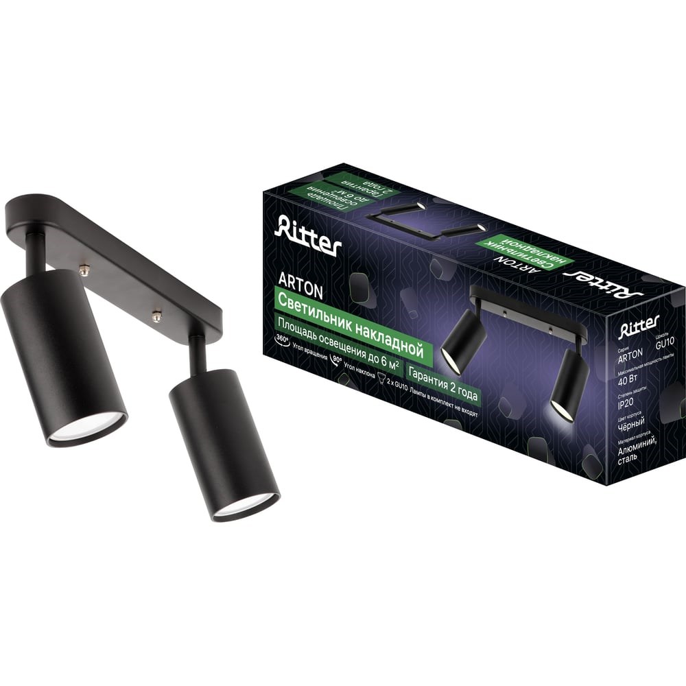 Накладной поворотный светильник RITTER Arton цилиндр 55x100x260 2хGU10 алюминий черный 59934 0 предназначен для акцентного освещения интерьера. В светильнике предусмотрены две лампочки с цоколем GU10, максимальной мощностью 40 Вт. Светильник просто монтируется и надежно фиксируется. Спот можно использовать в качестве настенного светильника вместо традиционных бра. А также вешать как потолочный светильник. Строгие геометрические формы светильника позволяют использовать его как в классических, так и в современных дизайнерских интерьерах. Накладные светильники часто располагают в гостиных, коридорах, спальнях и детских в качестве дополнительного источника света. А в небольших помещениях накладной спот может являться основным источником освещения. Благодаря цилиндрической форме поворотных светильников, свечение ламп распределяется ярко и равномерно, что позволяет получить больше света от каждой лампочки.