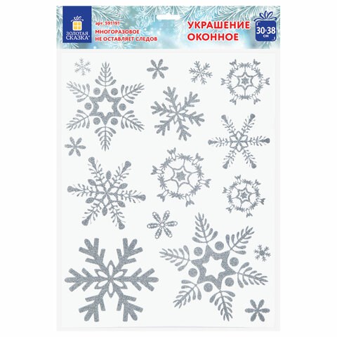 Наклейка для окон двусторонняя МНОГОРАЗОВАЯ 30х38 см "Снежинки", глиттер, серебро, ЗОЛОТАЯ СКАЗКА, 591191