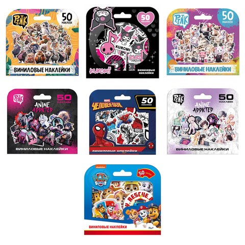 Наклейки виниловые НАБОР 50 штук, ассорти 7 дизайнов, PY, 64854, 665589