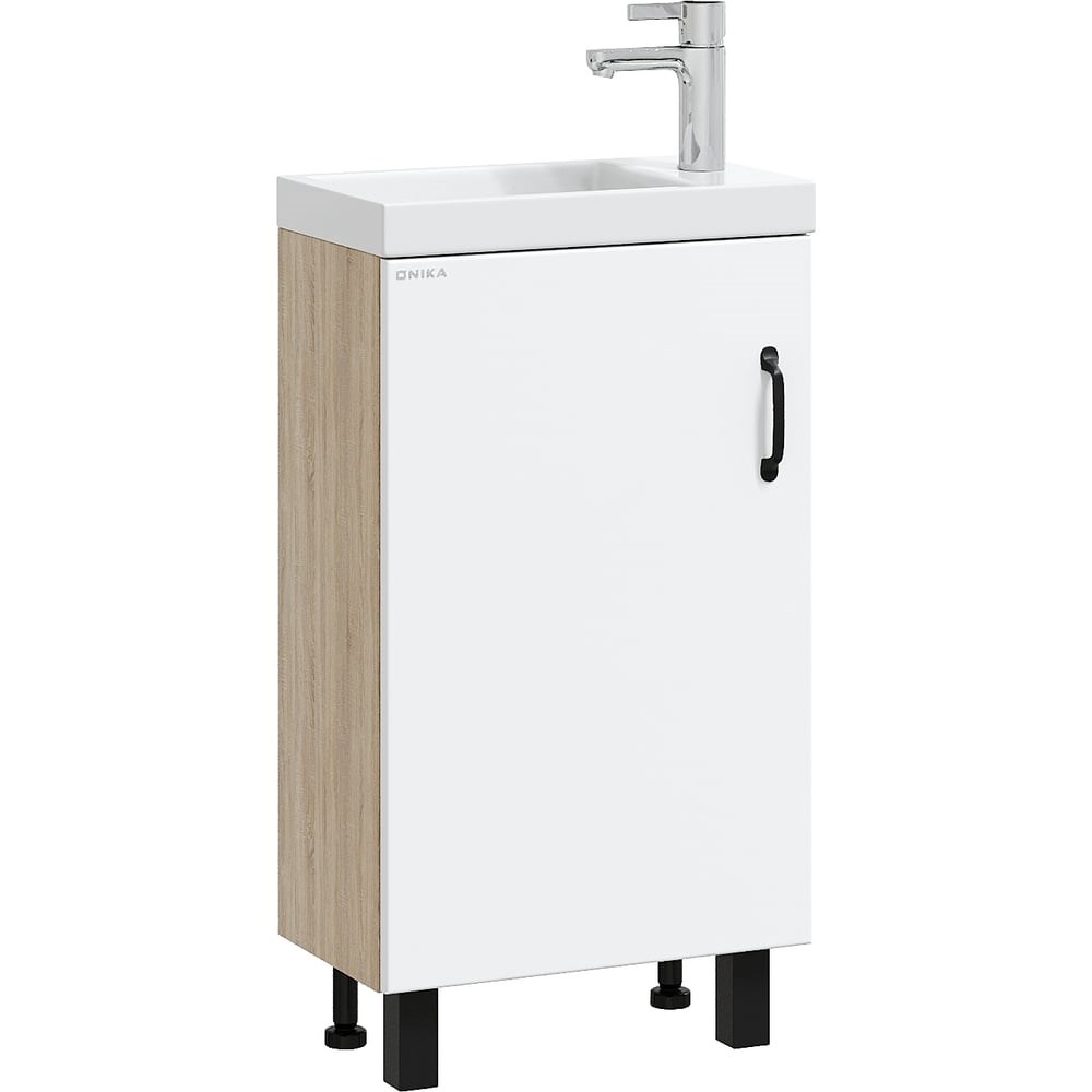 В тумбе Onika Тимбер 45 удачно сочетаются контрастные цвета и фактуры: белый матовый фасад с покрытием SoftTouch, корпус цвета дуба с роскошной текстурой, черная матовая металлическая фурнитура. Пространство за распашной дверцей, снабженной системой плавного закрывания, станет удобным местом для хранения различных бытовых принадлежностей. Корпус тумбы выполнен из ЛДСП, фасад - из ЛМДФ в пленке, устойчивых к механическим воздействиям, перепадам температур и высокой влажности. Черная металлическая ручка и 4 ножки (2 декоративных черных и 2 пластиковых) идут в комплекте с тумбой. Размеры тумбы без учета раковины и ножек: 45x26x68 cм.Размеры тумбы с учетом раковины и ножек: 45х26х83 см Гарантия на изделие 2 года. Совместимая раковина - Kirovit Фостер 45.