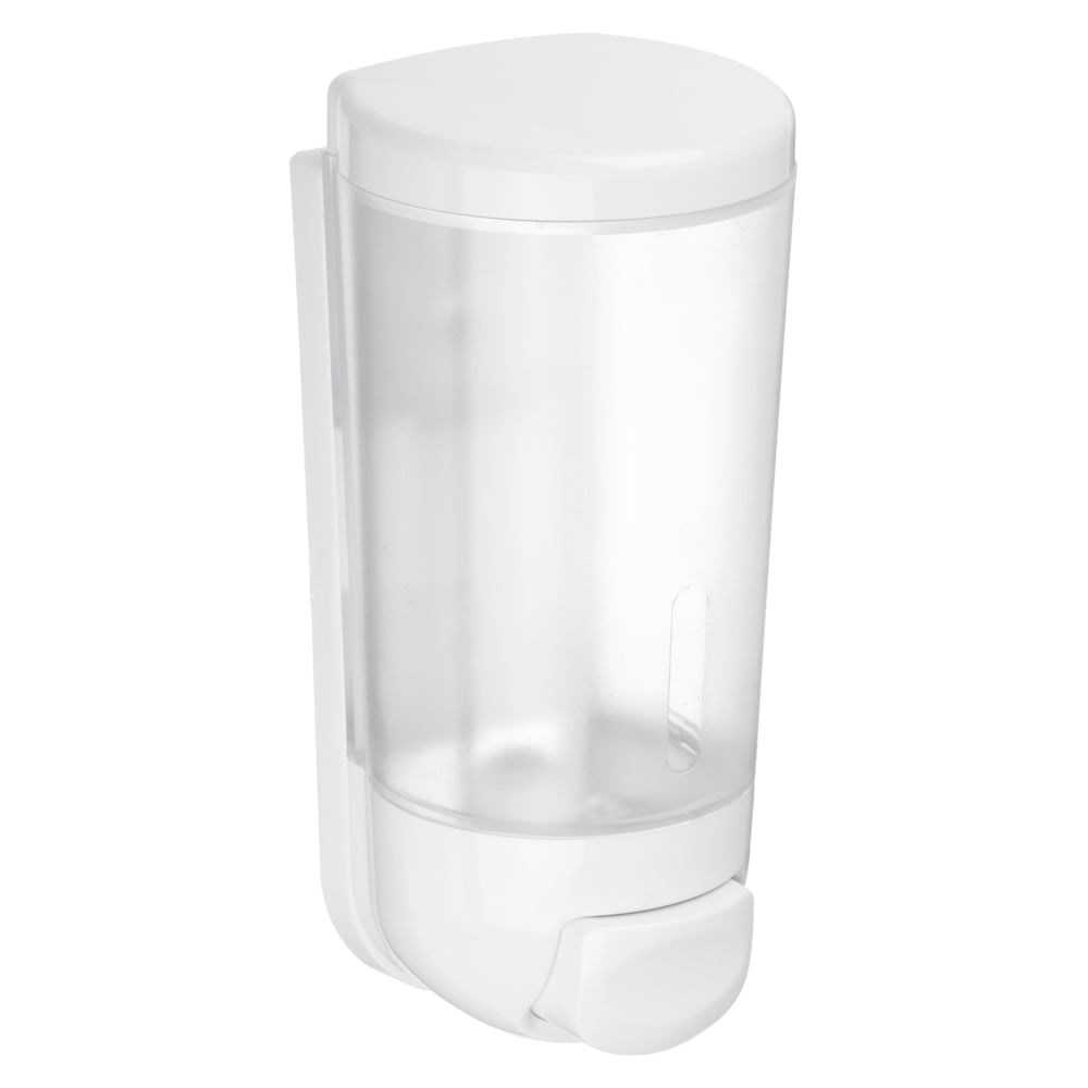 Настенный пластиковый дозатор для жидкого мыла объемом 400 мл предназначен для удобной подачи жидких моющих средств: мыла, геля для душа или шампуня. Полупрозрачный резервуар позволяет контролировать степень наполненности емкости. Мыло выдается путем нажатия на кнопку в нижней части корпуса. Дозатор плотно крепится к стене. Крепеж входит в комплектацию. Подходит как для дома, так и для мест общественного пользования.