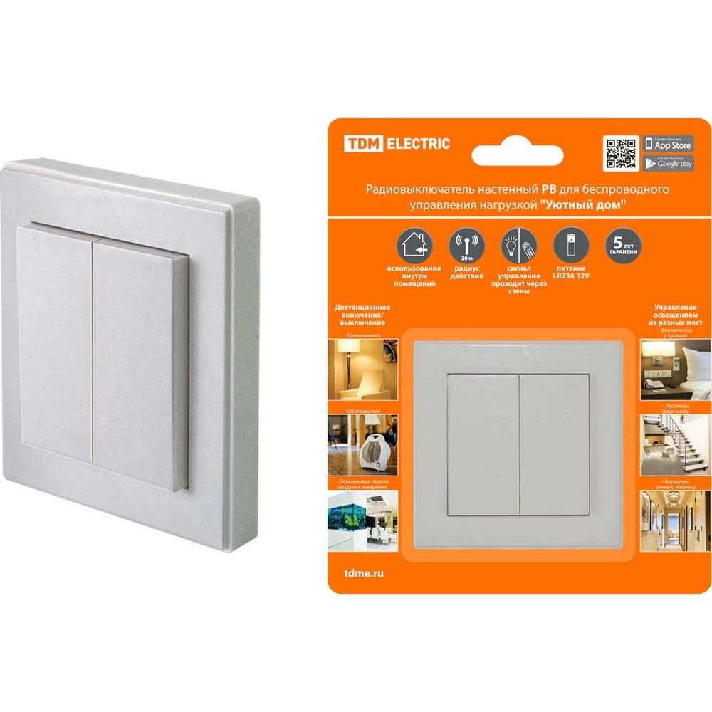 Радиовыключатель настенный РВ2 (2 клав.) от TDM ЕLECTRIC предназначен для дистанционного беспроводного управления освещением и электроприборами. Комфортное управление освещением: благодаря двум клавишам, вы сможете включать и выключать свет или электроприборыПолный базовый комплект для начала использования: в комплекте вы найдете радиовыключатель, пульт управления и все необходимые аксессуары для монтажа. Радиус действия до 30 метров: вы сможете управлять освещением или электроприборами из любой точки вашего дома или квартиры. Не требует специального монтажа: установка радиовыключателя проста и не требует специальных навыков. Универсальный пульт управления: в комплекте с радиовыключателем идет программируемый пульт управления, который можно использовать для других устройств серии ПУ-П и ПУ-Р. Конструкция: в ассортименте представлены контроллеры двух типов: с установкой в цоколь Е27 и в розетку 230 В, а также исполнения, имеющие в комплектации до 5 различных приемников. Материалы: пульты и контроллеры изготовлены из не поддерживающего горение пластика. Цвет: белый. Тип покрытия: глянцевая. Класс защиты (IP): IP44. Тип напряжения: постоянный ток (DC). Работает в системе Умный дом: да. Особенности: программируемый, механический. Комплектация: радиовыключатель 1шт, пульт управления. Выбирая радиовыключатель настенный РВ2 (2 клав.) от TDM ЕLECTRIC, вы получаете комфортное и надежное решение для управления освещением и электроприборами в вашем доме.