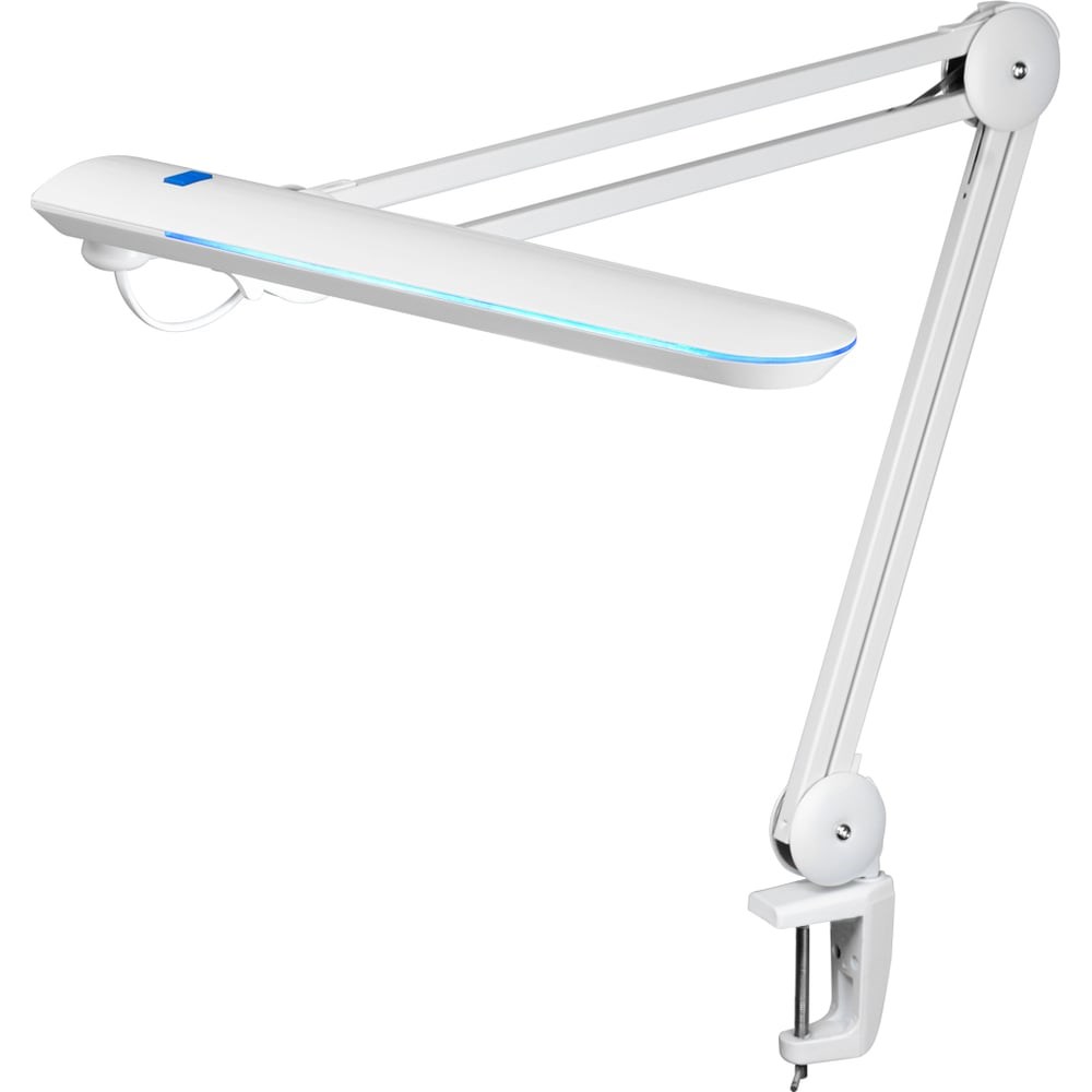 Лампа настольная на струбцине, 60 SMD LED, белая. Применяется в качестве дополнительного источника освещения. При помощи такого устройства можно с удобством прочитать текст, рассмотреть мелкие детали картин, структуру тканей, ювелирные изделия и т.д. Лампа может быть использована для организации работы в темное время суток. Изделие оснащено множеством рычагов и механизмов для точной фиксации в любом положении. Подходит для использования как взрослыми, так и маленькими детьми, в офисе, рабочем помещении или дома. На корпусе лампы имеется кнопка включения и выключения. Диоды лампы REXANT стабилизированы, что обеспечивает мгновенное включение и выключение лампы. Прибор крепится на любую плоскую горизонтальную поверхность с помощью струбцинного зажима. Благодаря лаконичному приятному дизайну устройство станет стильным дополнением Вашего рабочего пространства.