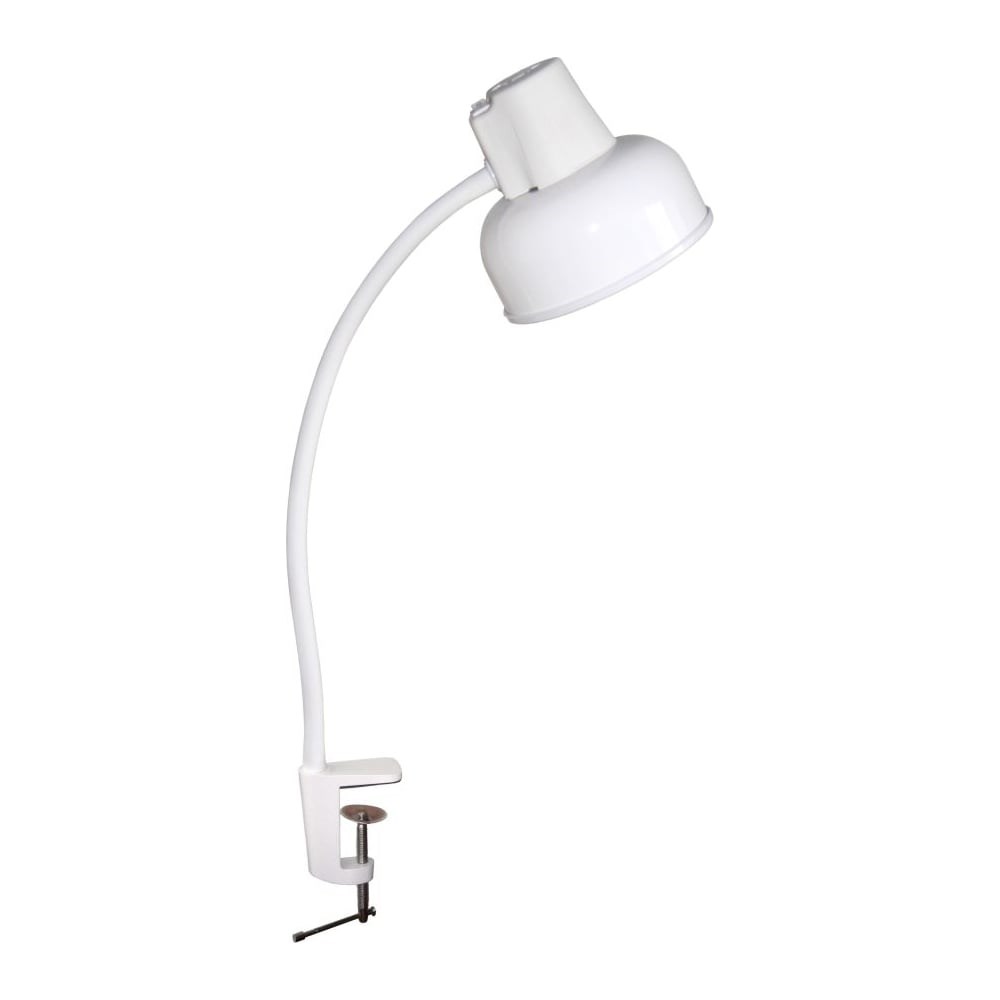 Светильник Бета-СШ белого цвета на гибкой стойке на металлической струбцине с цоколем Е27 (лампа в комплект не входит). Применяется в жилых, офисных, производственных помещениях, учебных заведениях и пр.