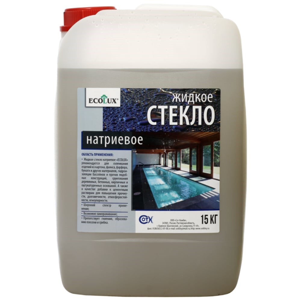 Жидкое натриевое стекло ECOLUX 15 кг 4607133682415 предназначено для склеивания изделий из картона, фаянса, фарфора, бумаги и других материалов, гидроизоляции бассейнов и прочих подобных конструкций, грунтования деревянных, бетонных, кирпичных и оштукатуренных оснований. А также в качестве добавки к цементным растворам для повышения прочности, долговечности, атмосферостойкости, огнеупорности. Преимущества: Препятствует гниению, образованию плесени и грибка Широкий спектр применения Возможно замораживание