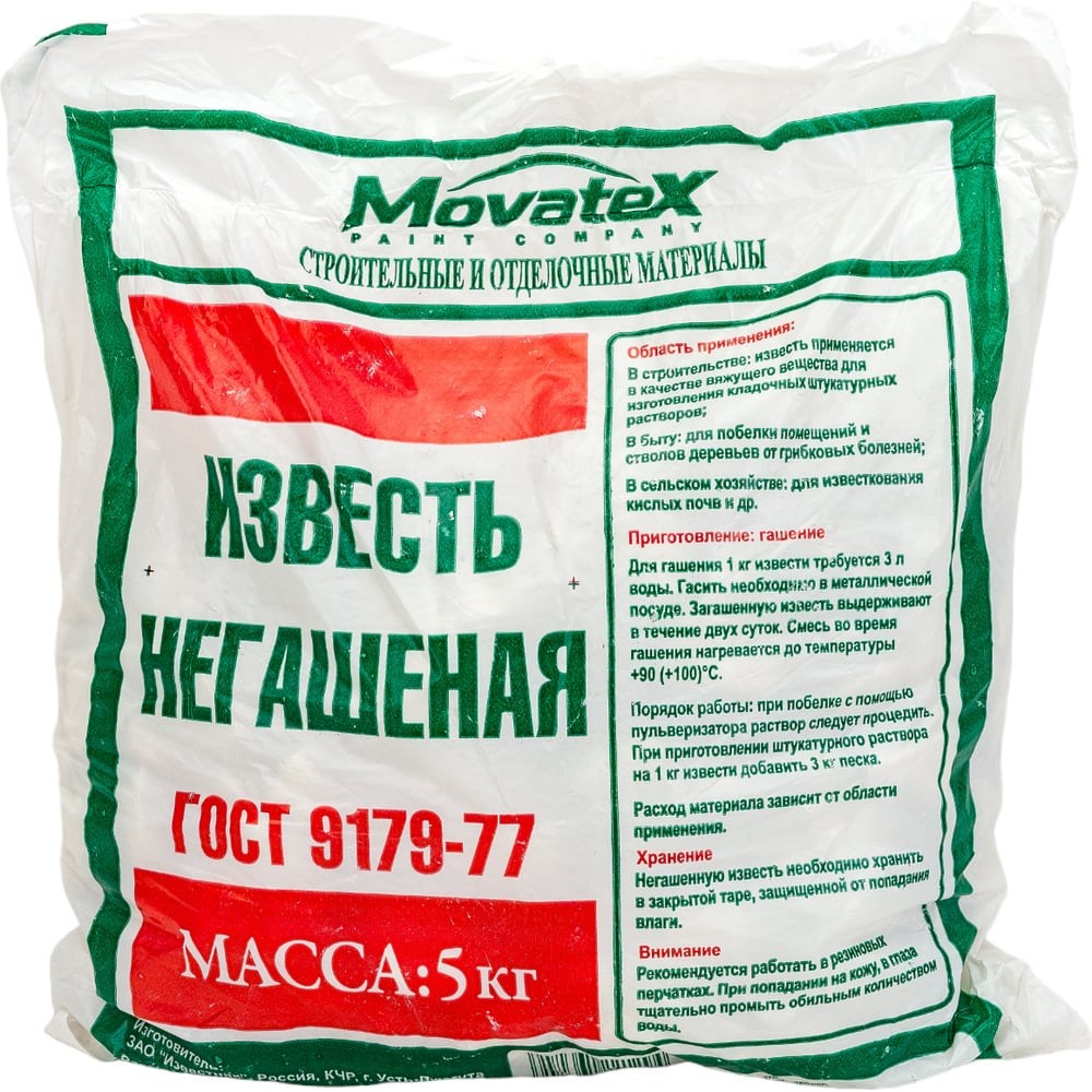 Негашеная КОМОВАЯ известь Movatex 5 кг Т02369Область примененияВ строительстве – в качестве вяжущего вещества для улучшения эластичности строительных растворов.В быту – для побелки различных элементов, штукатурки стенпомещений, стволов деревьев от грибковых болезней.В сельском хозяйстве – в качестве раскислителя почвы.ПриготовлениеДля приготовления (гашения) 1кг извести потребуется 3л воды. Гасить необходимо в металлической посуде. Внимание!Известь во время гашения увеличивается в объеме в 2-3 раза, нагреваясь до температуры +90 (+100)°С. Погашенную известь выдерживают в течение двух суток.При приготовлении штукатурного раствора на 1кг извести добавить 3кг песка.Порядок работыИзвесть наносится с помощью побелочной кисти. При нанесении с помощью пульверизатора, приготовленный раствор следует процедить.Расход материала зависит от области применения.Работы производить в резиновых перчатках. При попадании на кожу, в глаза необходимо тщательно промыть обильным количеством чистой воды.ХранениеНегашеную известь необходимо хранить в закрытой таре, защищенной от попадания влаги.Срок годностиНе ограничен.