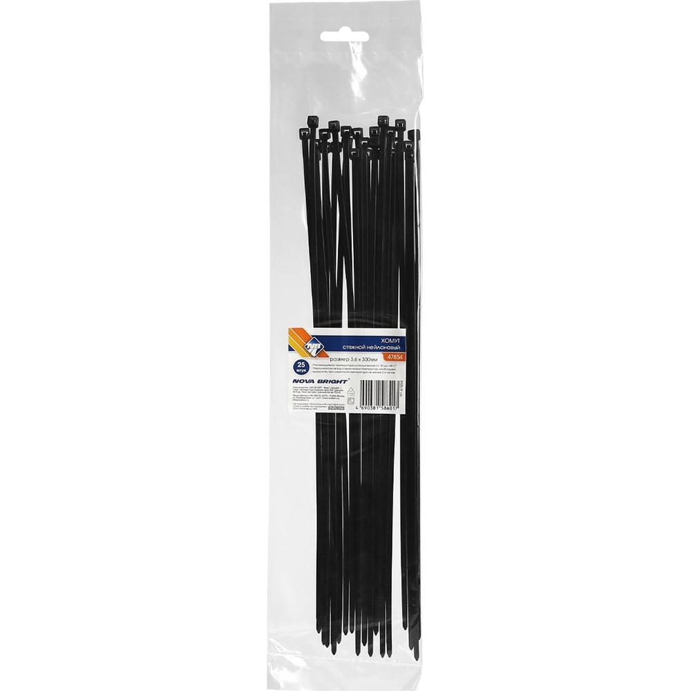 Нейлоновый хомут Nova Bright черный, 3.6x300 мм, 25 шт. 47854 представляет собой пластиковую полоску, на которую нанесены многочисленные насечки. На конце полоски предусмотрен пластиковый замок, который легко перемещается по всей её длине. При затягивании петли обеспечивается плотное соединение фиксатора с насечками. Таким образом, исключено произвольное открытие хомута.