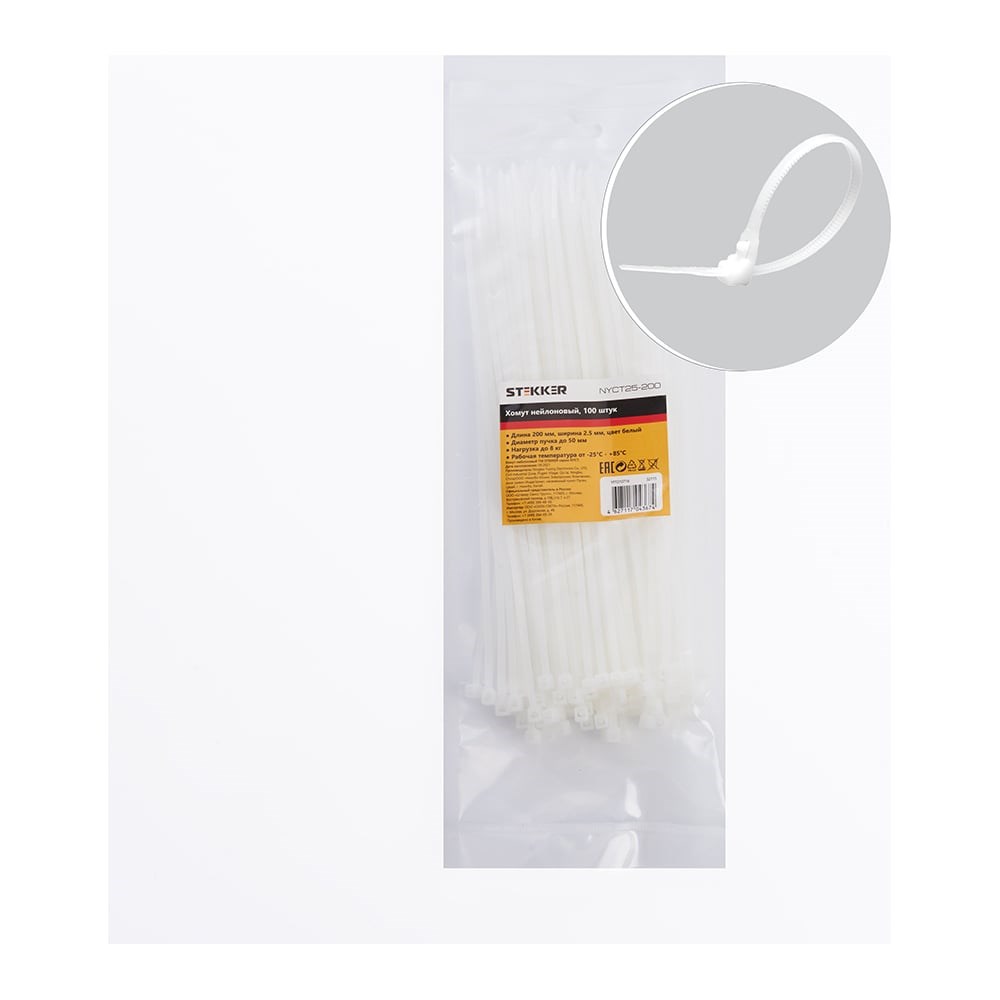 Нейлоновый хомут STEKKER 2,5x200 мм, d пучка max 50 мм, белый, NYCT25-200 100шт в упак 32775
