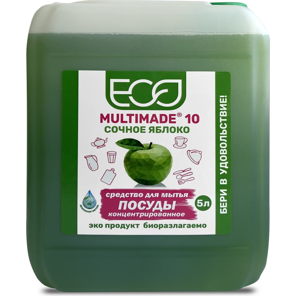 Мультимэйд 10 с ароматом зеленого яблока используется для мытья посуды, столовых приборов и других кухонных принадлежностей. Удаляет жир и загрязнения, устраняет неприятные запахи. Обладает высокой концентрацией.Средство гипоаллергенно, содержит смягчающие добавки, подходит для чувствительной кожи рук.Может использоваться в качестве универсального моющего средства для уборки, придания эстетического вида поверхностям, удаления масло-жировых, атмосферно-почвенных загрязнений, даже без последующего смывания водой.Откройте для себя полный ассортимент наших моющих средств для посуды с ароматами зеленого яблока, сочного лимона и алоэ вера объемами 1 л и 5 л.