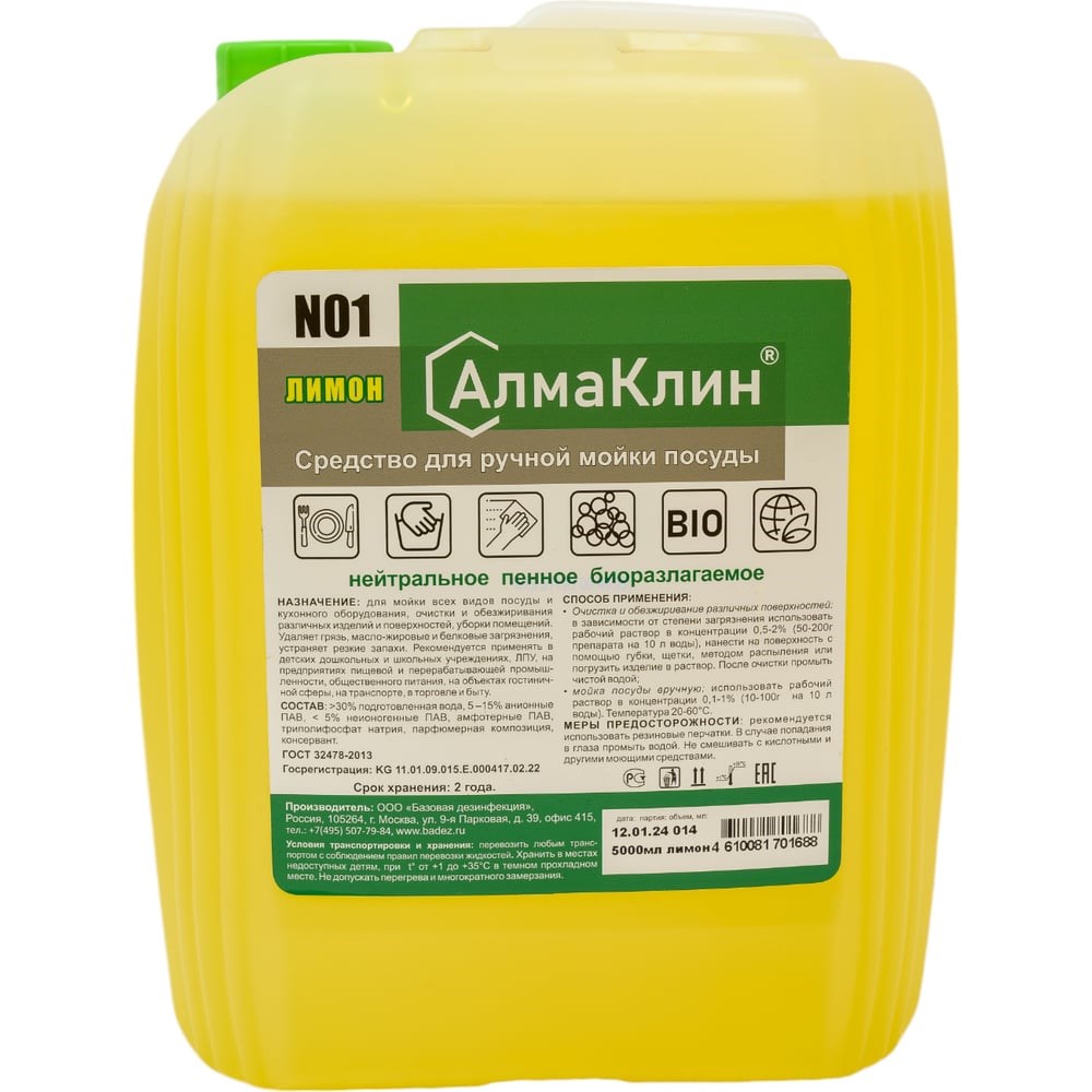 Нейтральное моющее средство для посуды ООО "БАЗОВАЯ ДЕЗИНФЕКЦИЯ" АлмаКлин N1, лимон, 5 л, евро канистра N1-ЛИМ-5Л для мойки всех видов посуды и кухонного оборудования, очистки и обезжиривания различных изделий и поверхностей, уборки помещений. Удаляет грязь, масло-жировые и белковые загрязнения, устраняет резкие запахи. Рекомендуется применять в детских школьных и дошкольных учреждениях, ЛПУ, на предприятиях пищевой и перерабатывающей промышленности, общественного питания, транспорта, в гостиничном хозяйстве, на транспорте, торговле и в быту.