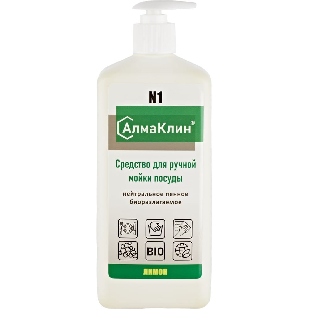 Нейтральное моющее средство для посуды ООО "БАЗОВАЯ ДЕЗИНФЕКЦИЯ" АлмаКлин N1, лимон, 1 л, дозатор-насос N1-ЛИМ-1Л для мойки всех видов посуды и кухонного оборудования, очистки и обезжиривания различных изделий и поверхностей, уборки помещений. Удаляет грязь, масло-жировые и белковые загрязнения, устраняет резкие запахи. Рекомендуется применять в детских школьных и дошкольных учреждениях, ЛПУ, на предприятиях пищевой и перерабатывающей промышленности, общественного питания, транспорта, в гостиничном хозяйстве, на транспорте, торговле и в быту.