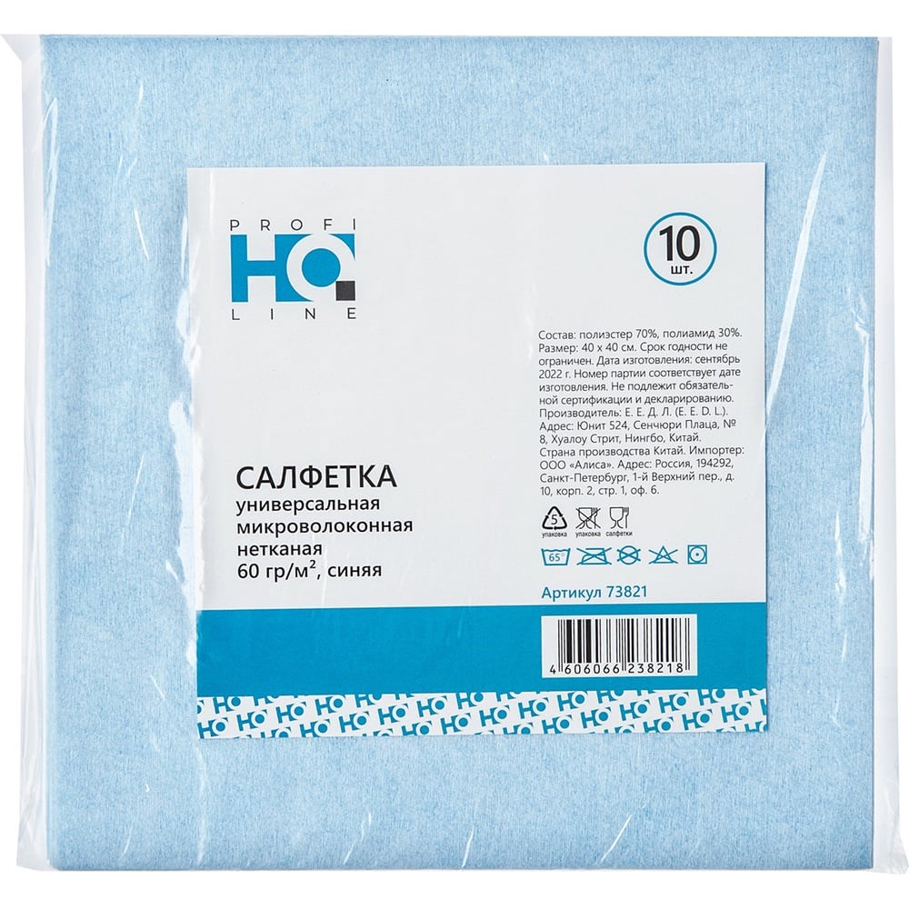 Салфетка нетканная микроволоконная 40х40см, 60 гр/кв.м, 10 шт., синяя HQ profiline 73821 не оставляет ворс на поверхности. Более эффективна в сравнении с вискозными аналогами. Не подвержена гниению, устойчива с размножению микроорганизмов, выдерживает стирку в стиральной машине. Мягкая, не царапает и не повреждает убираемую поверхность. Экономичная. Оптимально подходит для кухонных зон, мест общественного питания.