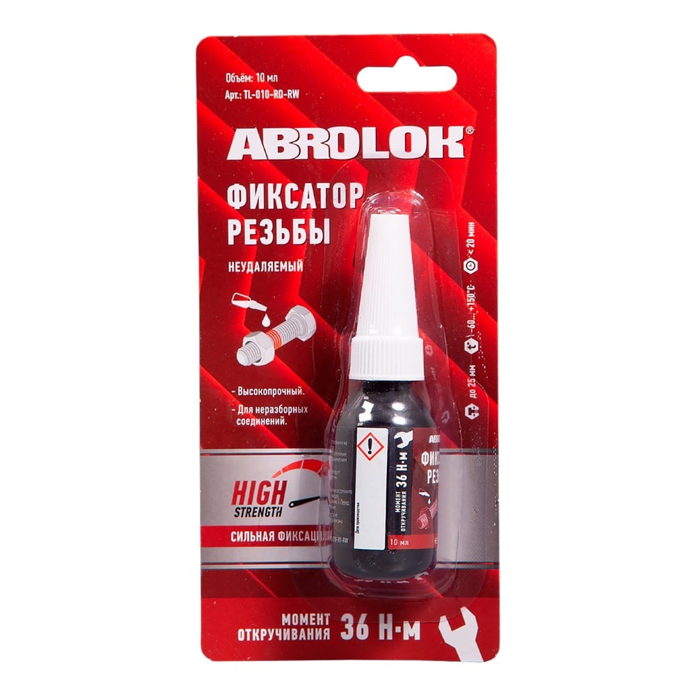 Фиксатор резьбовых соединений неудаляемый ABRO MASTERS красный 10 мл TL-010-RD-RW - высокопрочный анаэробный клей. Используется для фиксации металлических резьбовых соединений. Свойства: • момент откручивания: 36 Н·м; • фиксирует и герметизирует соединение, придает ему вибростойкость; • защищает соединение от коррозии; • неудаляемый: идеален для фиксации резьбовых соединений, не требующих частой разборки; • подходит для использования на пассивных металлах: нержавеющей стали, алюминии, поверхностях с гальваническим покрытием; • максимальный диаметр фиксируемых деталей: 25 мм; • диапазон рабочих температур: -60°C…+150°C.