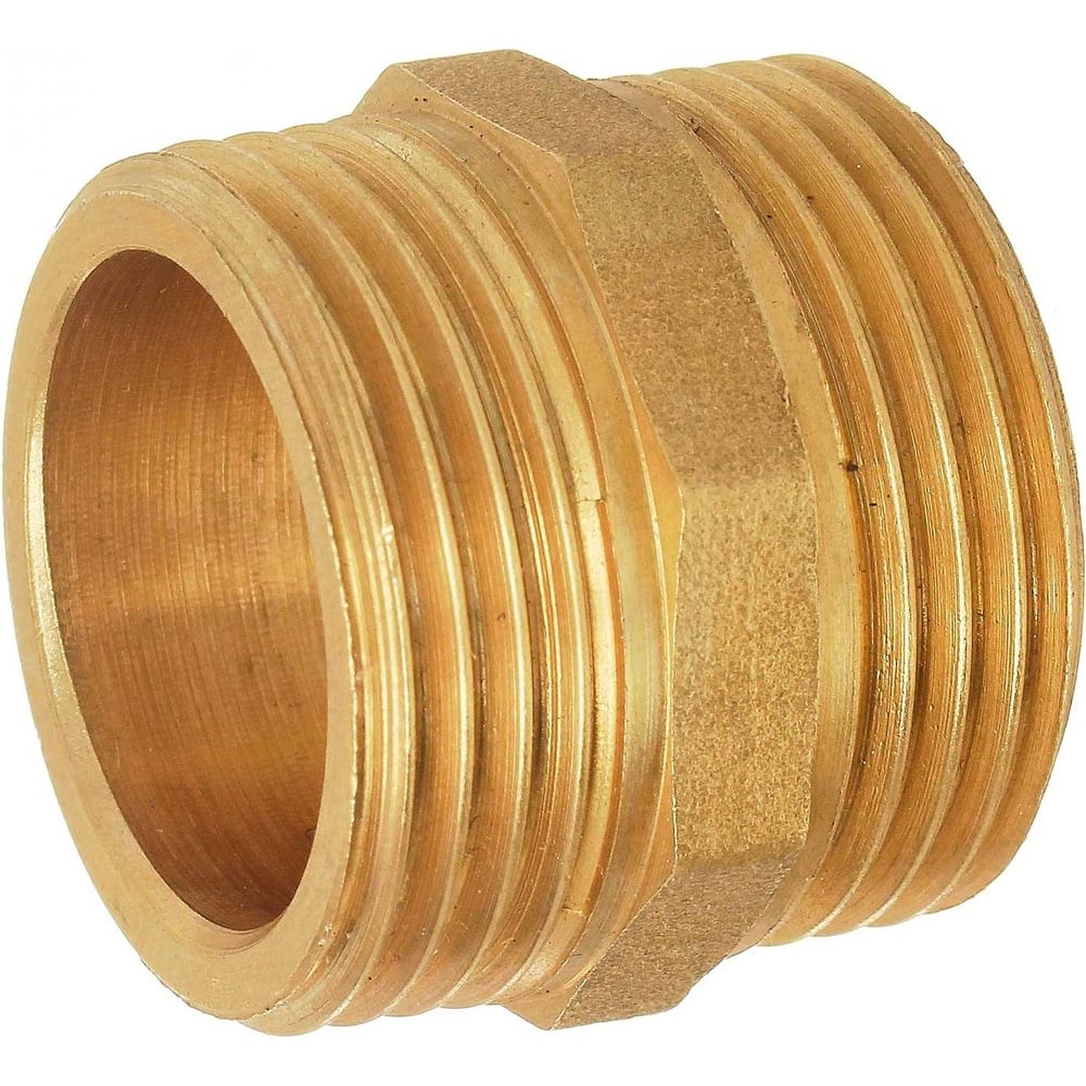 Ниппель (наруж.-наруж.) — латунный фитинг, представляющий собой изделие с наружной резьбой на обоих концах, с помощью которых он соединяется с другими участками трубопровода равного диаметра, резьба цилиндрическая трубная по ГОСТу 6357-81. Предусмотрен участок корпуса шестигранной формы, под гаечный ключ. Фитинги рассчитаны на рабочее давление (PN) 2,5 и 4,0 МПа и температуру транспортируемых сред от -20 до +150 °С.