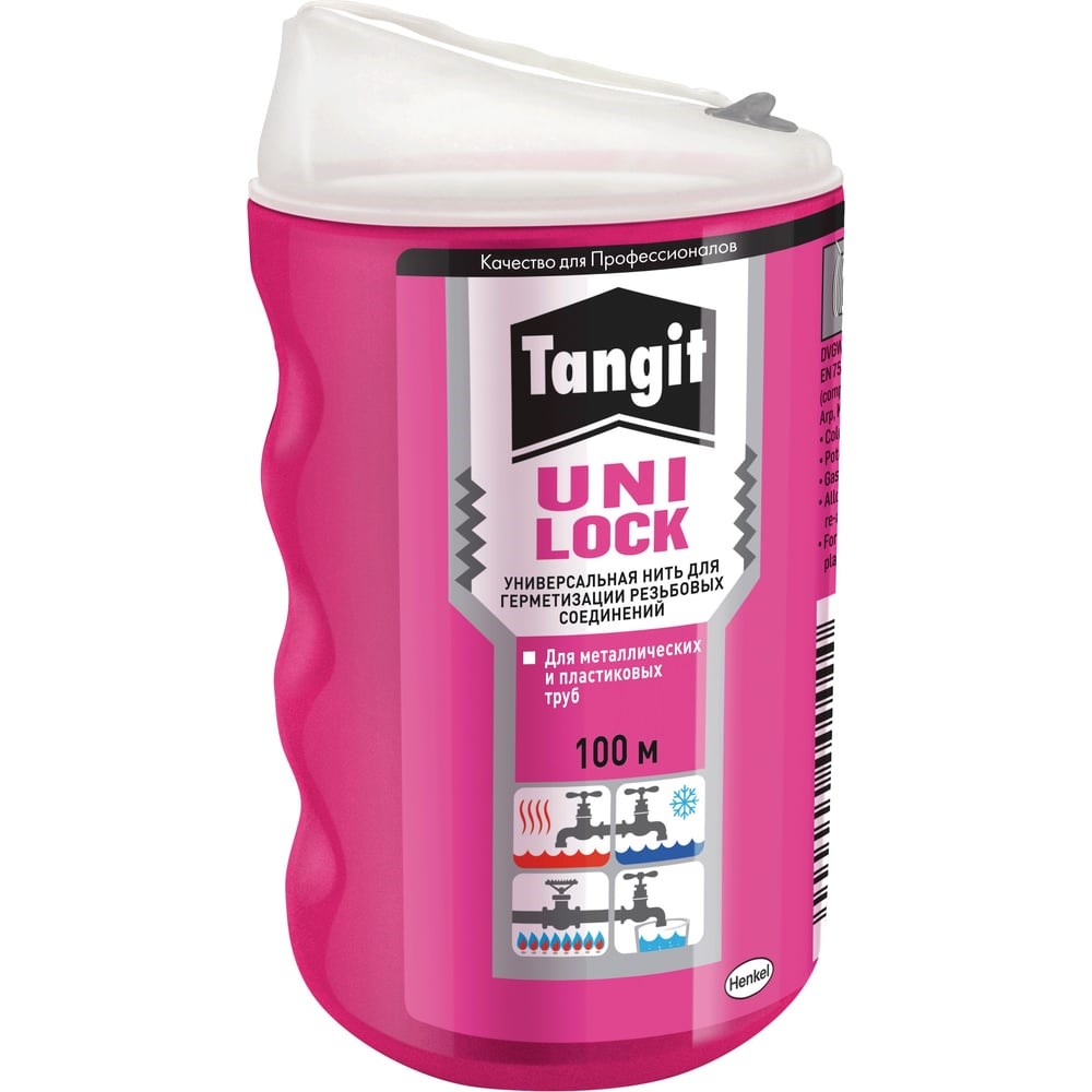 Нить для герметизации резьбовых соединений Тангит 100 м 2169520 - универсальная нить для герметизации резьбовых соединений труб холодной и горячей воды, питьевой воды, газа, отопления. Позволяет герметизировать снабженные резьбой узлы (ISO 7-1), например муфты и фитинги труб как с цилиндрической, так и конической резьбой. Позволяет, не теряя герметичности, регулировать соединения труб. Может использоваться для всех типов металлических и пластиковых фитингов и труб до 6``O.D. Упаковка позволяет просто и удобно использовать нить. Дополнительные характеристики: Устойчивость к воздействию температуры/давления Газ: от -20°С до +70°С, <= 5 бар; Горячая вода: до +130°С, <= 7 бар; Питьевая вода: до +85°С, <= 16 бар; Стойкость к газам 1-й, 2-й и 3-й группы.