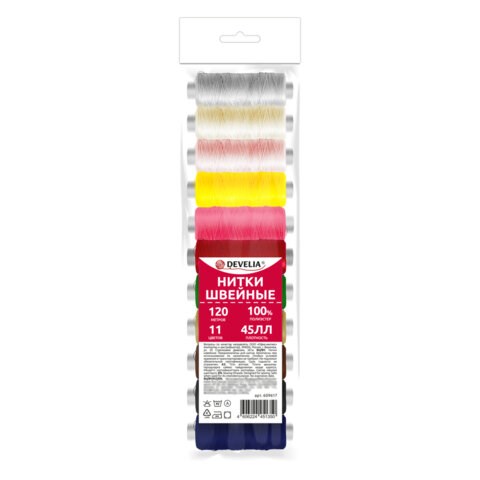 Нитки швейные 45 ЛЛ, 120 м, полиэстер, НАБОР 11 цветов, DEVELIA (Девелиа), 609617