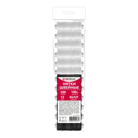 Нитки швейные 45 ЛЛ, 200 м, полиэстер, НАБОР 12 штук, 6 белых / 6 черных, DEVELIA (Девелиа), 609620