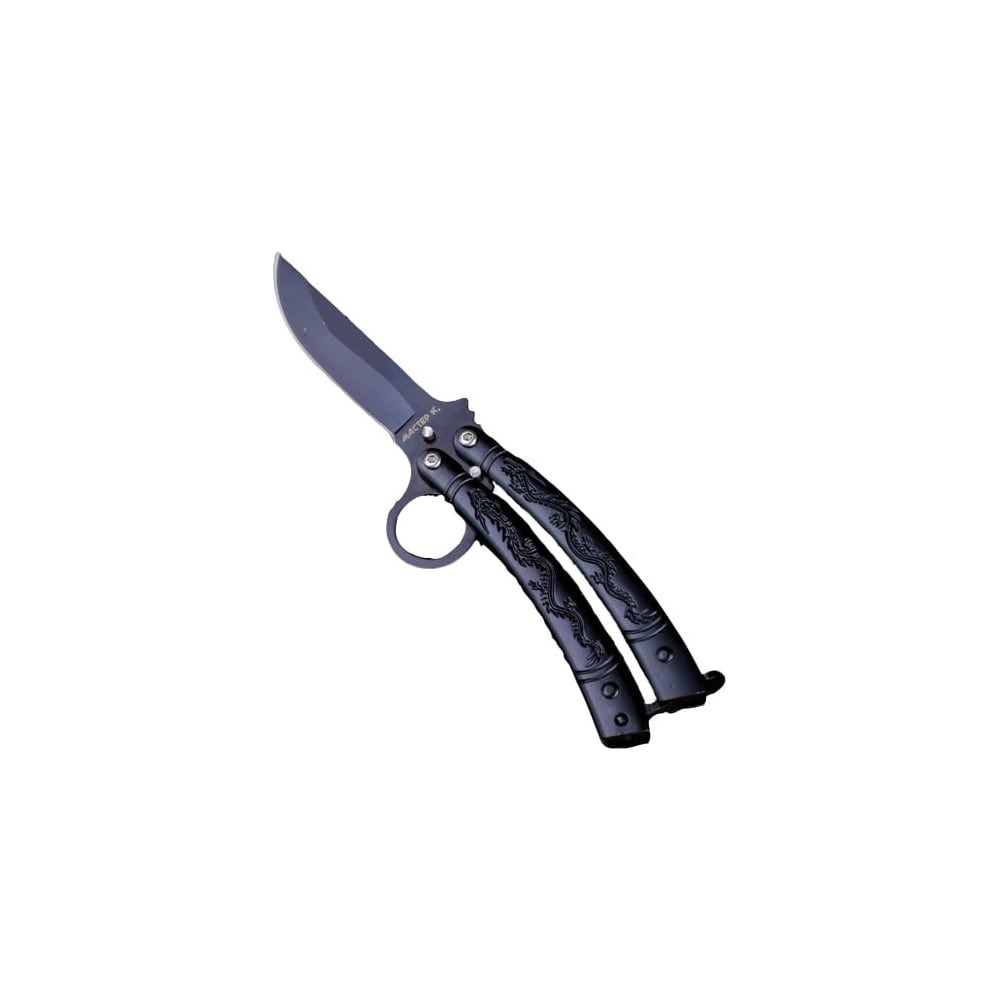 Нож-бабочка Мастер К лезвие с прямым обухом 7.5 см, рукоять с драконами 9.5 см 2301155 подходит для использования в туристических поездках, походах, на рыбалке и охоте. Лезвие изготовлено из прочной хромированной стали, что обеспечивает долгий срок службы. Безопасное хранение. Рукояти оснащены защелкой, которая предотвращает их случайное раскладывание.