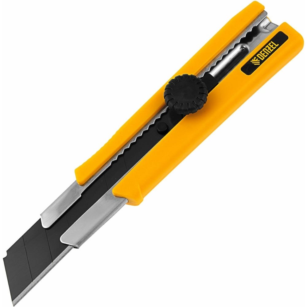 Нож DENZEL 25 мм, сменное лезвие, SK4, корпус из TPR, металлическая направляющая, винтовой фиксатор 78945 предназначен для резки линолеума, ковролина, бумаги, обоев, картона и других листовых материалов. Лезвие ножа изготовлено из высокоуглеродистой инструментальной японской стали SK-4, твердость режущей кромки- 65 HRC. Материал отличается высокой прочностью и долговечностью. Смена сегмента лезвия производится путем обламывания по линии насечки. При обламывании необходимо одевать средства индивидуальной защиты - очки, перчатки.