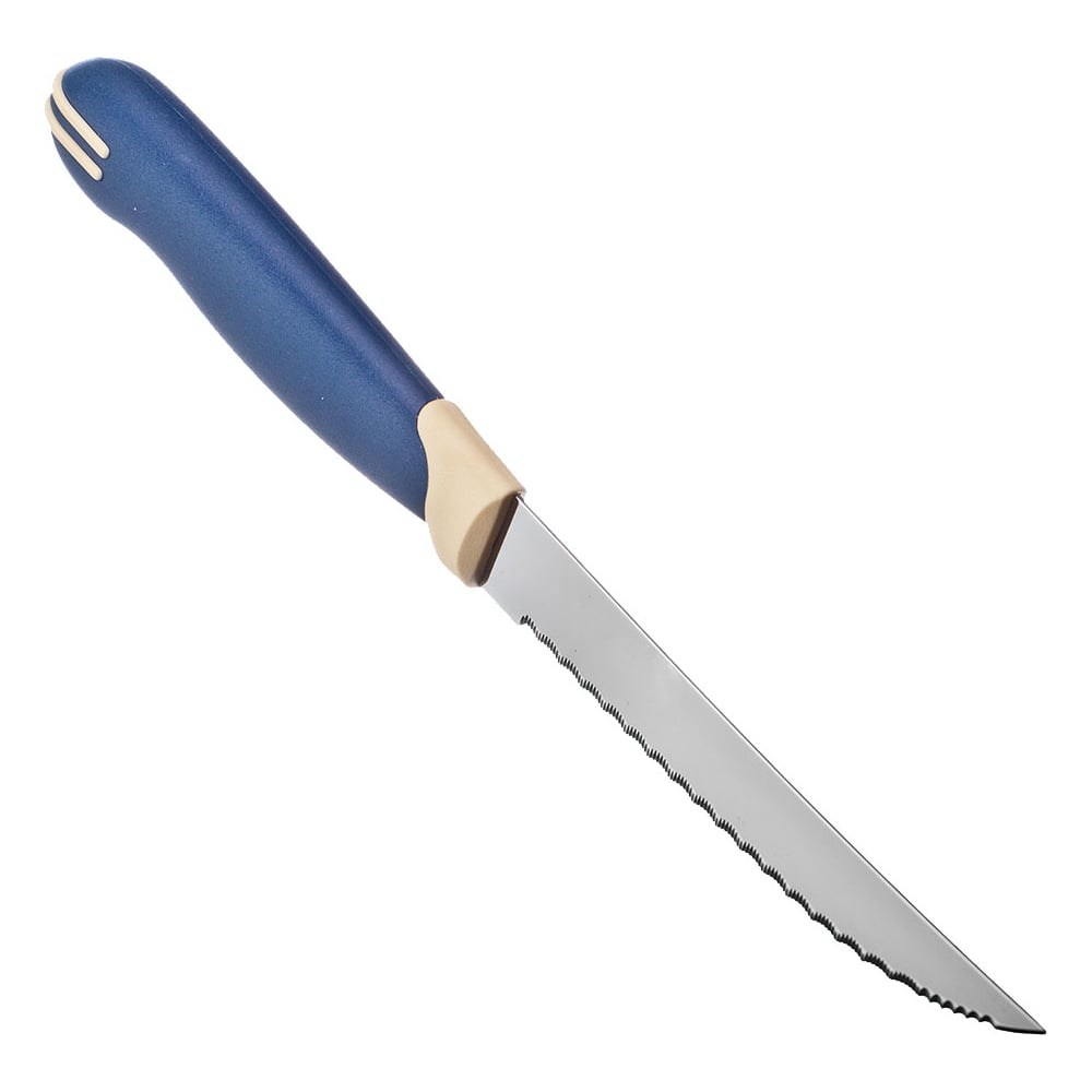 Нож Tramontina Multicolor предназначен для нарезки стейков. Благодаря уникальному методу закалки в несколько этапов сталь приобретает особую пластичность, коррозийно и жаростойкость, сохраняя твердость порядка 53 единиц по шкале Роквелла. Как результат, ножи TRAMONTINA требуют более редкой правки и заточки, что обеспечивает более долгий срок службы по сравнению с ножами из аналогичной стали других производителей. Рукоятки серии Multicolor выполнены из полипропилена, долговечны, выдерживают температуру до 130°C.