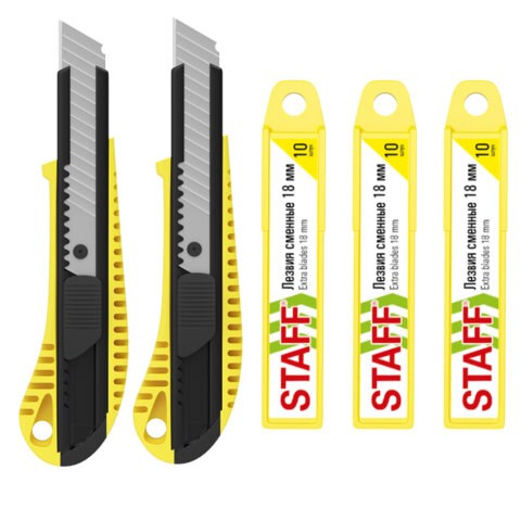 Нож канцелярский 18 мм, КОМПЛЕКТ 2 шт. + 30 ЛЕЗВИЙ, металлические направляющие, STAFF "Original", 273931