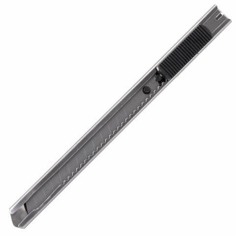 Благодаря своей обтекаемой форме нож удобно держать в руке. Металлический корпус с клипом защищает лезвие шириной 9 мм от повреждений и гарантирует безопасность применения. Автофиксатор позволяет закрепить положение лезвия в нужном положении с помощью защелки. Нож усиленный надежно удерживают лезвие и позволяет выдерживать большую нагрузку. Чтобы восстановить функциональность инструмента из-за затупившегося лезвия, необходимо обломать его по наклонной метке на поверхности лезвия. При этом его нужно выдвинуть только на одно деление. В щель на снятой крышке необходимо поместить затупившийся край лезвия ножа. Инструмент нужно держать в руках таким образом, чтобы лезвие было обращено вверх той стороной, где нет разделительных меток. После этого необходимо согнуть лезвие по линии излома ОТ СЕБЯ. При этом затупившийся обломок остаётся в щели крышки, а инструмент вновь становится пригодным к полноценной работе.