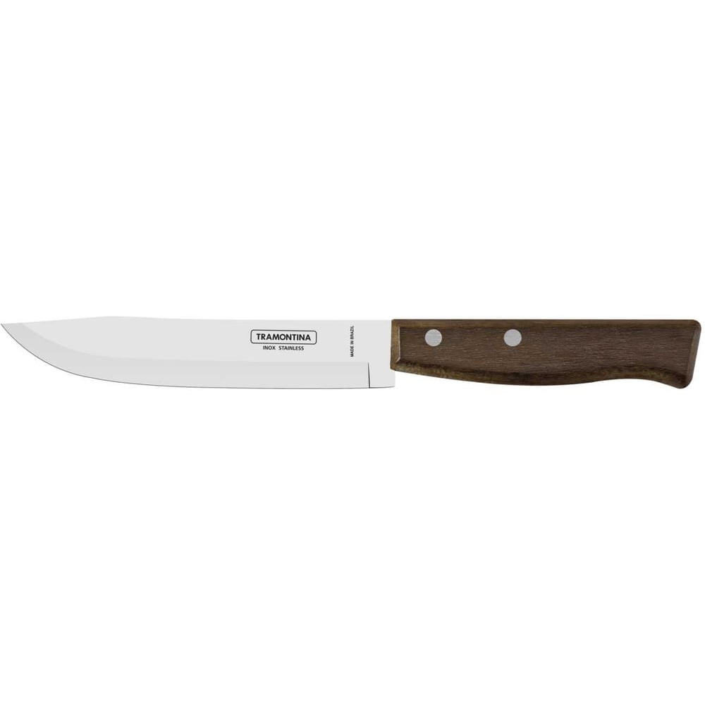 Нож Tramontina Tradicional подходит для нарезки мяса. Благодаря уникальному методу закалки в несколько этапов сталь приобретает особую пластичность, коррозийно и жаростойкость, сохраняя твердость порядка 53 единиц по шкале Роквелла. Как результат, ножи TRAMONTINA требуют более редкой правки и заточки, что обеспечивает более долгий срок службы по сравнению с ножами из аналогичной стали других производителей. Рукоятки серии Tradicional выполнены из натурального дерева.
