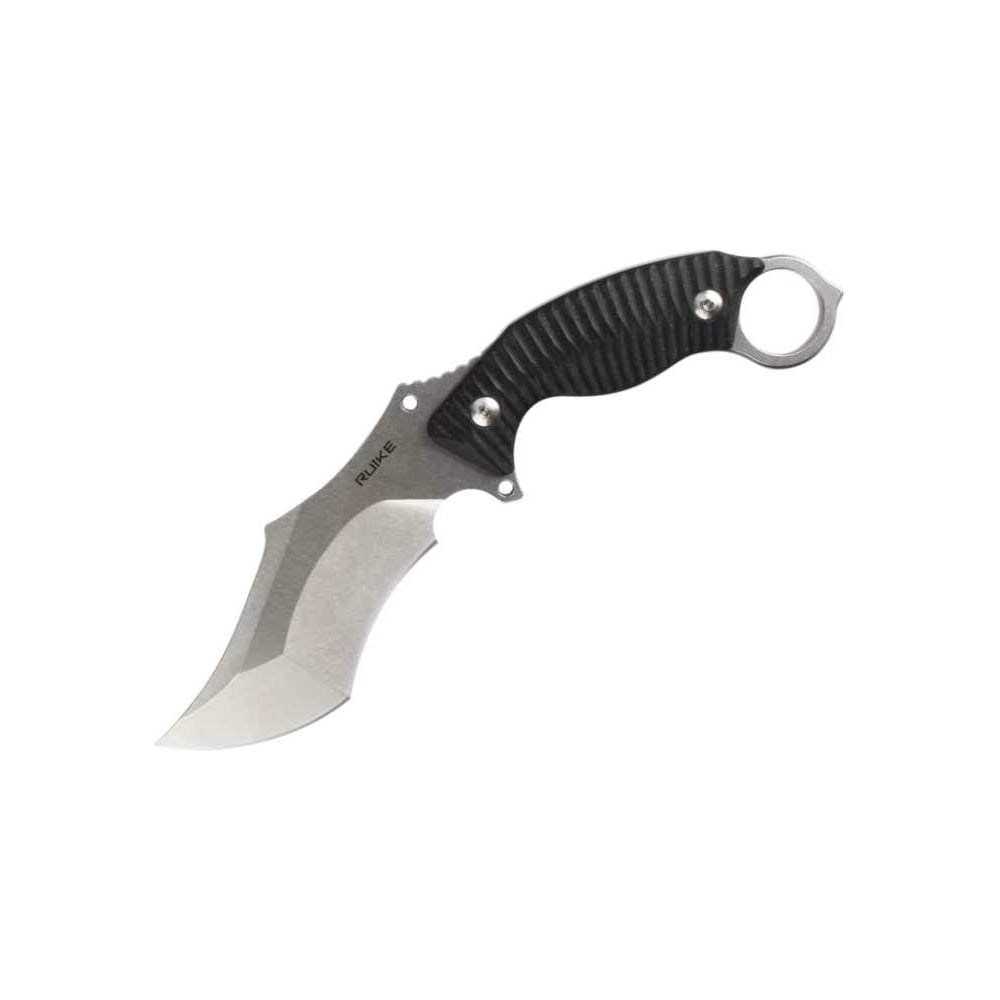 Нож с фиксированным лезвием Ruike F181-B представляет собой модель с фиксированным клинком. Это нож разновидности «керамбит», лезвие которого имеет сложную форму, предназначенную для тактики. В основе клинка – сталь марки Sandvik 14C28N, рукоять изготовлена из стеклотекстолита G10. Сталь имеет сбалансированный химический состав, что обеспечивает высокую твёрдость и стойкость к ржавчине. Стеклотекстолит достаточно прочный и стойкий к повреждениям материал, хорошо переносит влагу, отлично поддаётся окрашиванию. К тому же, G10 устойчив к воздействиям высоких температур. Вместе с ножом прилагаются ножны для хранения, выполненные из AБС-пластика. Ножны предусматривают разные варианты крепления.