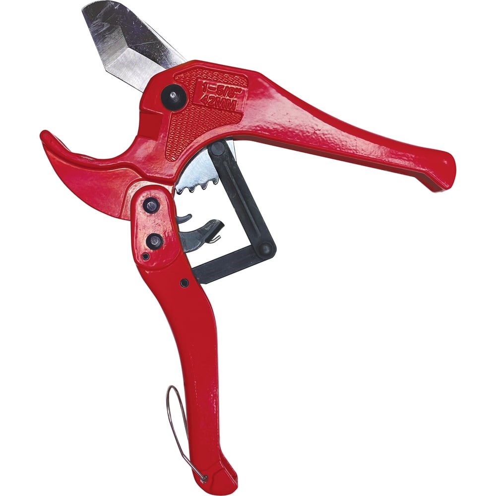 Ножницы SANEXT обеспечивают разрезание под прямым углом пластиковых труб диаметром до 40 мм. Конструкция инструмента включает нож из нержавеющей стали, храповой механизм, фиксирующую ножницы в закрытом положении.
