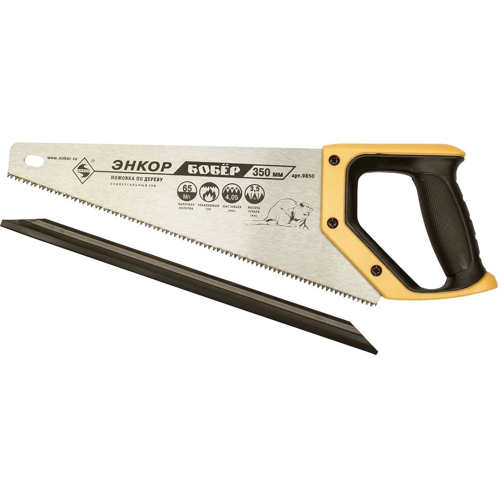 Ножовка с закаленным зубом Энкор Бобер 9850 предназначена для распила заготовок из древесины. Полотно выполнено из стали 65 Mn с заточенными под двумя углами зубьями. Пластиковая рукоятка частично обрезинена для надежного хвата и удобства при работе. Зубья высотой 3.5 мм разведены, что обеспечивает гладкость реза.