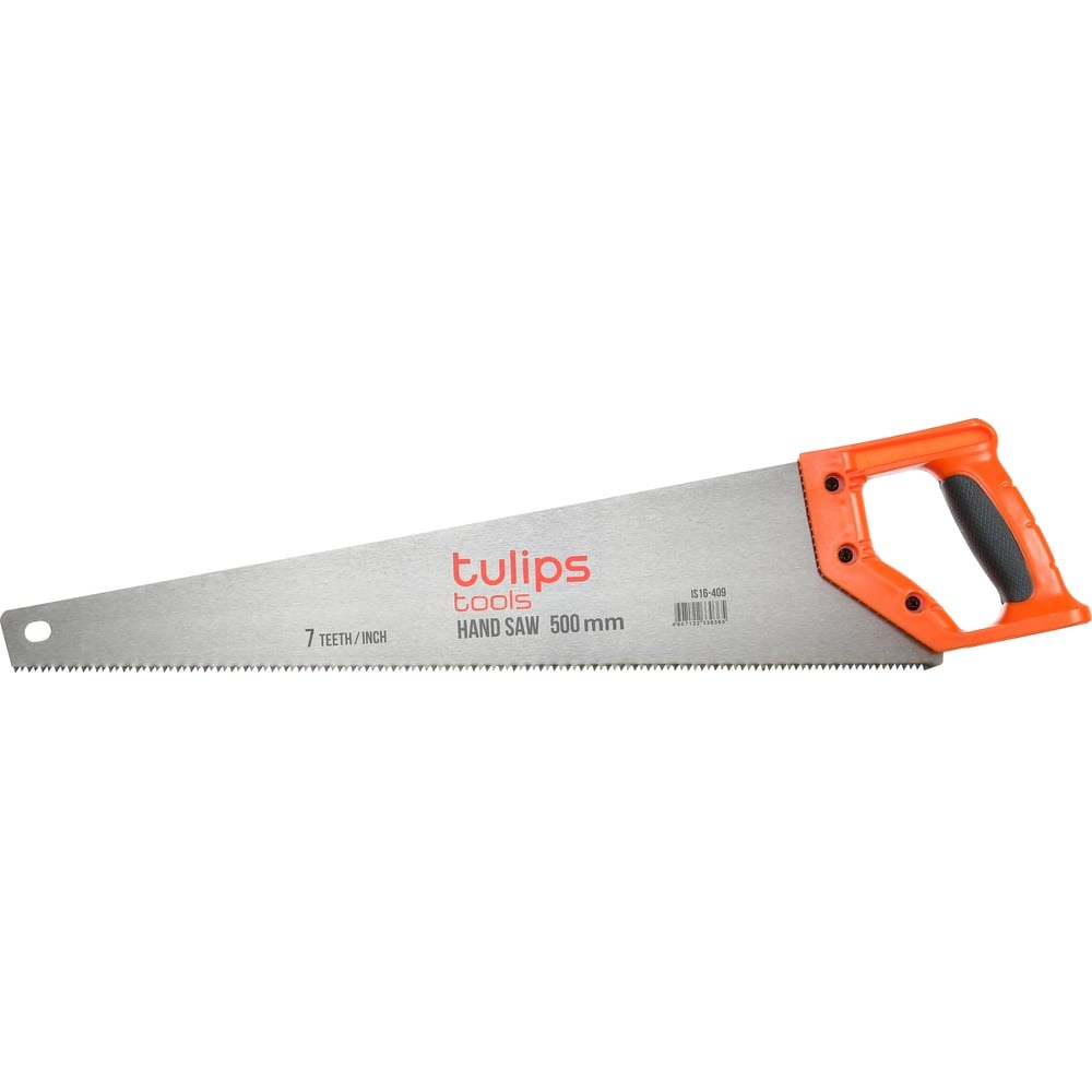Ножовка по дереву 500 мм Tulips tools IS16-409 имеет удобную двухкомпонентную рукоятку, надежно закрепленную на полотне при помощи винтов. Полотно из высокопрочной углеродистой стали имеет каленый зуб большого размера 7 TPI (7 зубьев на дюйм) с двухгранной заточкой.