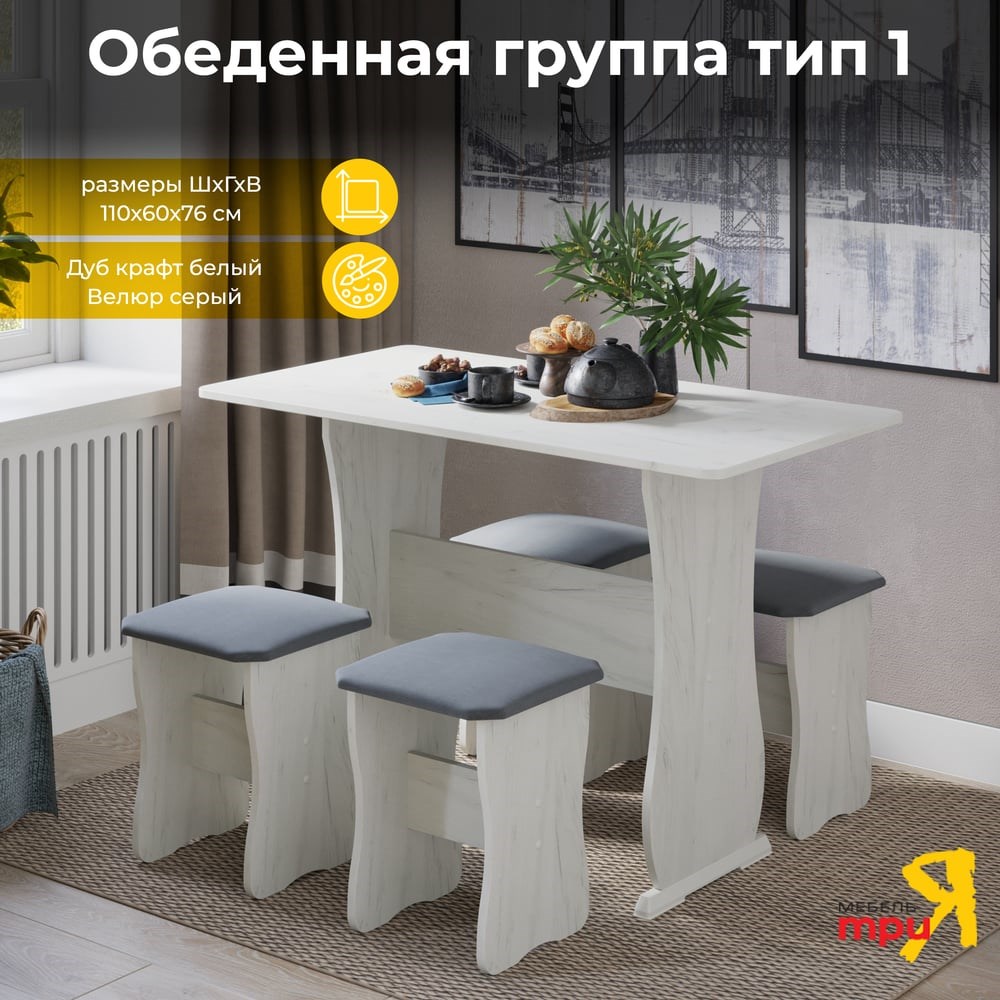 Обеденная группа тип 1 включает себя четыре табурета и стол. Классический минималистичный дизайн, сбалансированная конструкция, доступная цена и разнообразие расцветок набора позволяют приобрести подходящую модель для помещения, оформленного в любом стиле. Исполнение кухонного столика заключается в простых формах, является устойчивым и компактным, что дает возможность сэкономить место на кухне и обеспечивает дополнительное пространство. Стулья оснащены мягкой обивкой из пенополиуретана, что создает комфорт и удобство при сидении. Каркас изготовлен из высококачественного материала ЛДСП - 16мм, столешница - 22 мм. За столом могут разместиться до 4 человек. Комплект мебели представляет собой функциональной и мобильной, а также качественной продукцией и экологически чистым изделием. Набор выглядит гармонично, создавая благоприятную и располагающую атмосферу. Поставляется в разобранном виде. Фурнитура для сборки и инструкция в комплекте.Прежде чем приступить к сборке, необходимо убедиться в качестве, количестве и соответствии всех деталей. Если таковые выявлены, незамедлительно свяжитесь с площадкой и продавцом, для разрешения вопроса, не приступая к сбору. Товар после сборки возврату и обмену не подлежит.