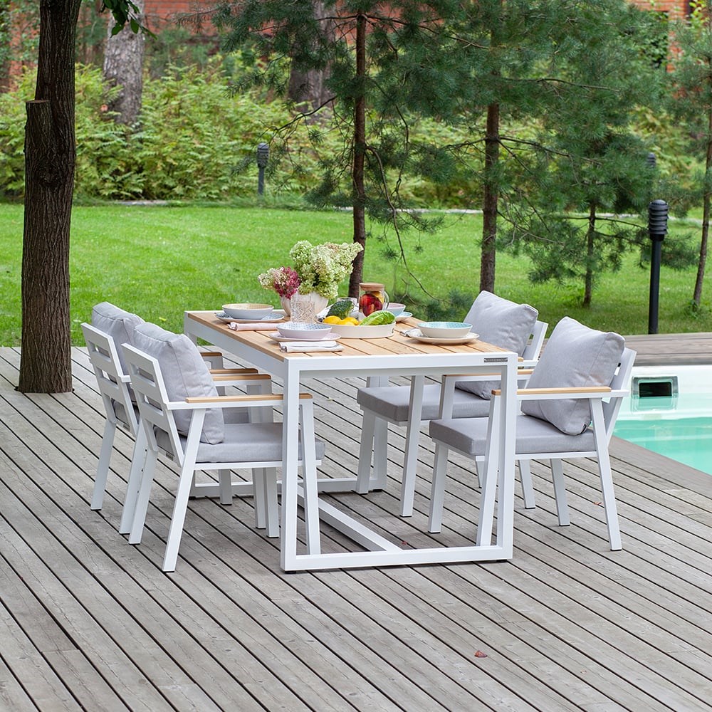 Комплект обеденной мебели SANTORINI создает уютную зону для отдыха и приема гостей в саду, на террасе коттеджа. В наборе на 4 персоны представлены обеденный стол и 4 удобных стула. Каркас мебели изготовлен из высокопрочного алюминия с полимерным покрытием белого цвета, столешница стола и подлокотники выполнены из массива лиственницы. Для комфортной посадки в комплекте идут мягкие подушки в съемных чехлах из мебельной рогожки светло-серого оттенка. Алюминиевая мебель отличается долгим сроком службы, подходит для улицы и помещений. Обеденная группа органично впишется в интерьер загородного дома, клуба, ресторана, отеля. Набор садовой мебели доставляем в собранном виде в надежной упаковке.