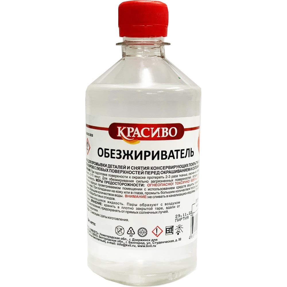 Обезжириватель Красиво (1 л/0,62 кг) 4631152351380 предназначен для промывки деталей и снятия консервирующих покрытий, удаления всех типов масел и жиров с любых поверхностей перед окрашиванием и склеиванием. СОСТАВ: нефтяные растворители. СПОСОБ ПРИМЕНЕНИЯ: При подготовке поверхности к окраске протереть 2-3 раза тканью, смоченной обезжиривателем, и дать поверхности высохнуть 5-10 минут. Для обезжиривания сильно загрязненных поверхностей, потереть до полного удаления загрязнений и дать высохнуть. Огнеопасно! Токсично! Вредно при контакте с кожей! МЕРЫ ПРЕДОСТОРОЖНОСТИ: работать на открытом воздухе или в хорошо проветриваемом помещении с использованием средств защиты органов дыхания, в плотных резиновых перчатках и очках. При попадании на кожу или в глаза, промыть большим количеством теплой воды. При разливе собрать ветошью, затем промыть большим количеством воды. ВНИМАНИЕ: не сливать в канализацию и водоемы. Тару с остатками продукта плотно закрыть и утилизировать в организованные места сбора бытовых отходов. ХРАНЕНИЕ: хранить в плотно закрытой таре, вдали От нагревательных приборов отопления, предохранять от прямых солнечных лучей.