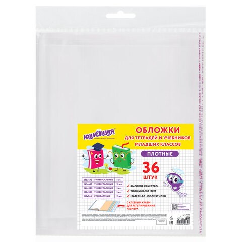 Обложки ПЭ для тетрадей и учебников младших классов, НАБОР 36шт, КЛЕЙКИЙ КРАЙ, 110 мкм, ПЛОТНЫЕ, универсальные, прозрачные, ЮНЛАНДИЯ, 274116