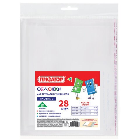 Обложки ПП для тетрадей и учебников, КЛЕЙКИЙ КРАЙ, НАБОР 28 шт., ПЛОТНЫЕ, 80 мкм, ПИФАГОР, 274113