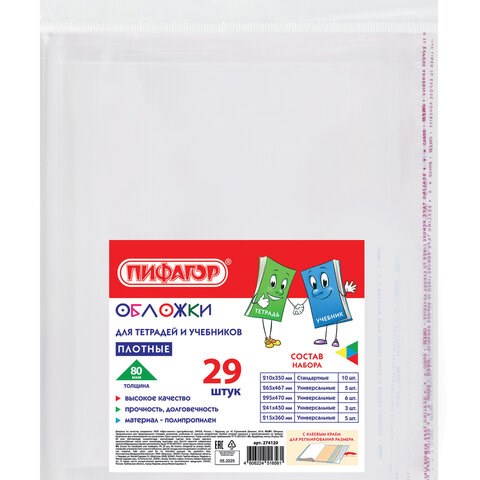 Обложки ПП для тетрадей и учебников, КЛЕЙКИЙ КРАЙ, НАБОР 29 шт., ПЛОТНЫЕ, 80 мкм, ПИФАГОР, 274120