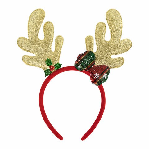 Новогодний пластиковый ободок красного цвета украшен золотыми оленьими рогами, красно-зелёным бантом и символом Рождества – остролистом.