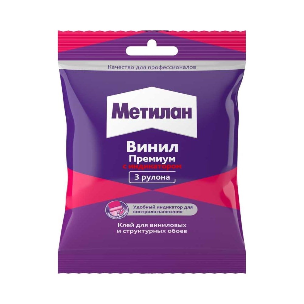 Обойный клей Метилан Винил Премиум 100 г рекомендуется для таких видов обоев, как виниловые, текстильные, бумажные, включая шелкографию. Для того, чтобы нанесение клея было равномерным, в составе предусмотрен цветовой индикатор: в процессе высыхания розовый клей становится прозрачным. В качестве основы используются модифицированные эфиры крахмала.