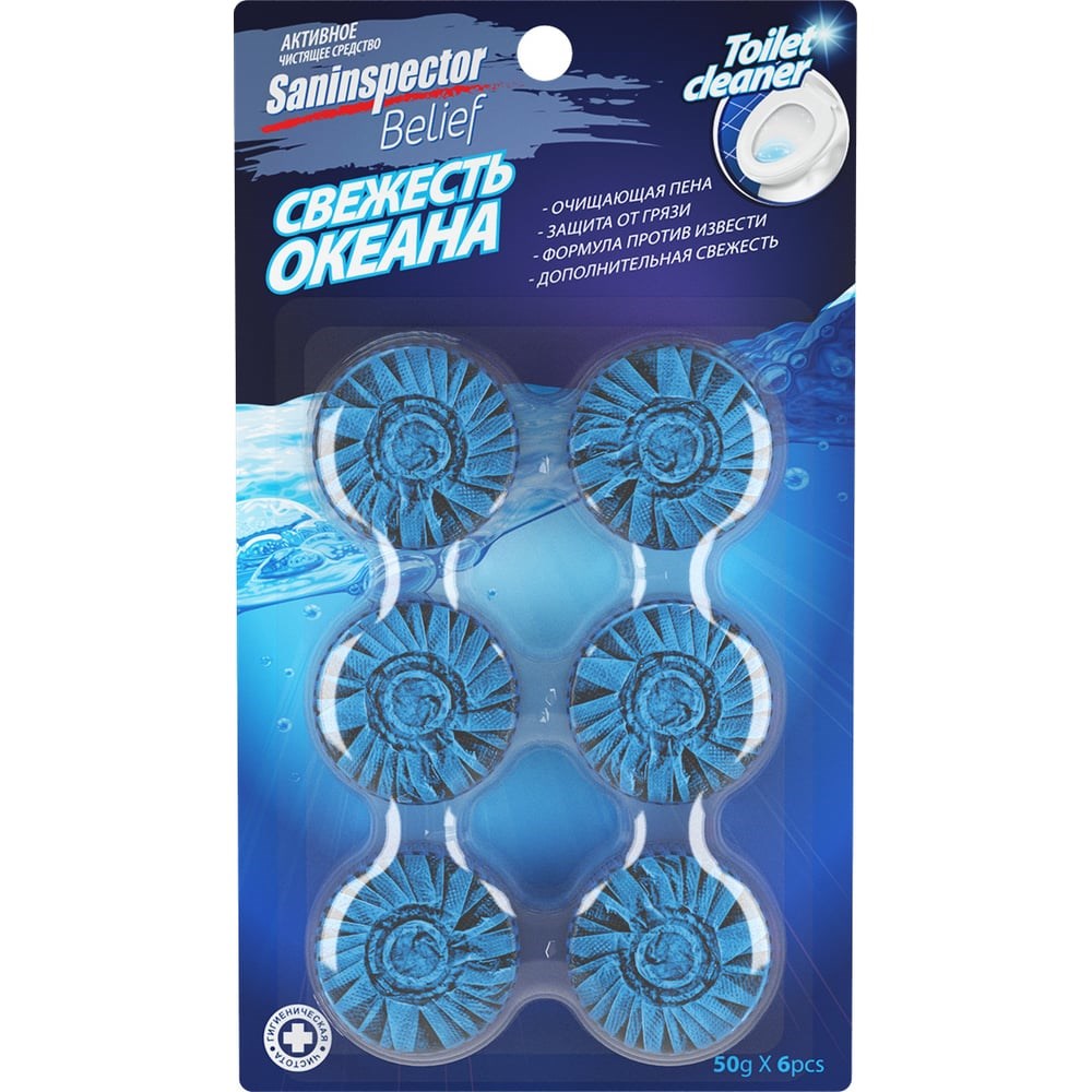 Таблетки очищающие для сливного бачка SanInspector Belief Свежесть океана. очищающая пена защита от грязи формула против извести дополнительная свежесть