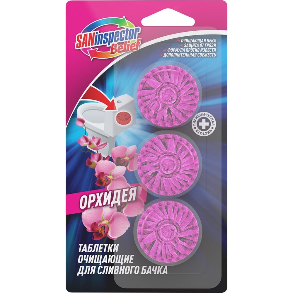 Таблетки очищающие для сливного бачка «СанИнспектор» с ароматом орхидеи С 4-кратным сочетанием активных ингредиентов: ОЧИЩАЮЩАЯ ПЕНА: очищает унитаз при каждом сливе воды. ФОРМУЛА ПРОТИВ ИЗВЕСТИ: предотвращает известковый налет. ЗАЩИТА ОТ ГРЯЗИ: защищает от повторного загрязнения. ДОПОЛНИТЕЛЬНАЯ СВЕЖЕСТЬ: обеспечивает приятный свежий аромат. Одна очищающая таблетка для сливного бачка СанИнспектор эффективно поддерживает гигиеническую чистоту, предотвращает появление известкового налета, а также после каждого смывания придает устойчивый и свежий аромат туалетной комнате. Способ применения: 1. Не снимайте защитную пленку с таблетки СанИнспектор. 2. Поместите таблетку в сливной бачок (1 таблетки хватает до 500 смывов*). 3. Перед первым смывом подождите 10 минут. 4. Если окрас воды пропал, используйте новую таблетку СанИнспектор. Интенсивность окрашивания воды при растворении таблетки зависит от частоты смываний, качества воды и может отличаться от интенсивности цвета таблетки до использования.