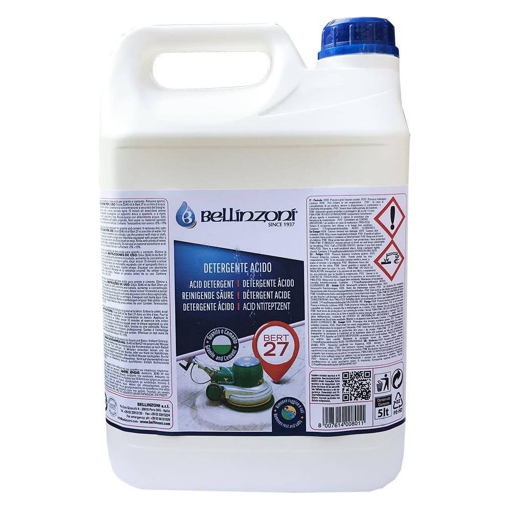 Очиститель Bellinzoni Bert-27 кислота 5 л 004200002 подходит для гранита и керамики. Эффективно удаляет сильные загрязнения, в том числе ржавчину и следы селитры. Обладает антисмольными характеристиками (против дыма и копоти). Объема в 5 литров хватит на длительное время.