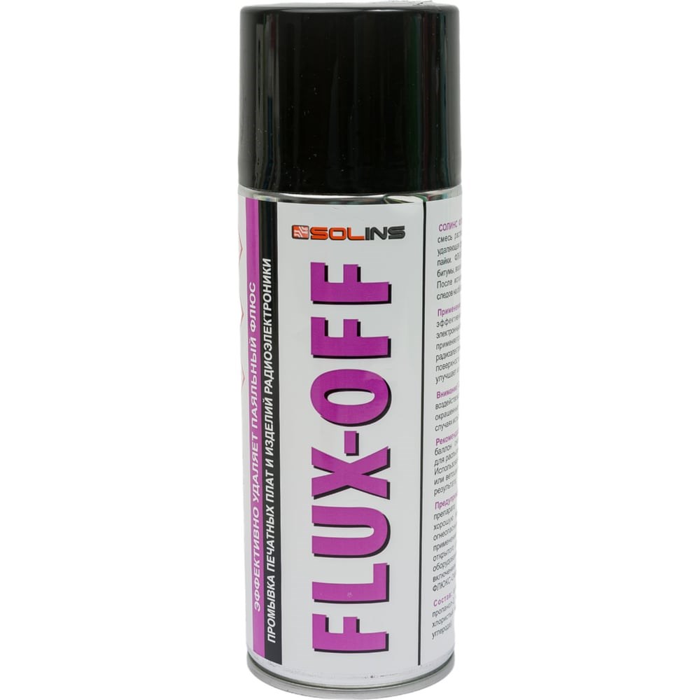 Очиститель печатных плат FLUX-OFF Solins объем 400мл - быстро и надежно удаляет масла, смазки, битумы, воски и другие нефтяные загрязнения. После испарения, средство не оставляет следов на обрабатываемых поверхностях. Используется для бережной, но интенсивной очистки печатных плат, микроэлектронных узлов и других электронных компонентов. Применяется для обезжиривания электронных приборов в целом и их частей.